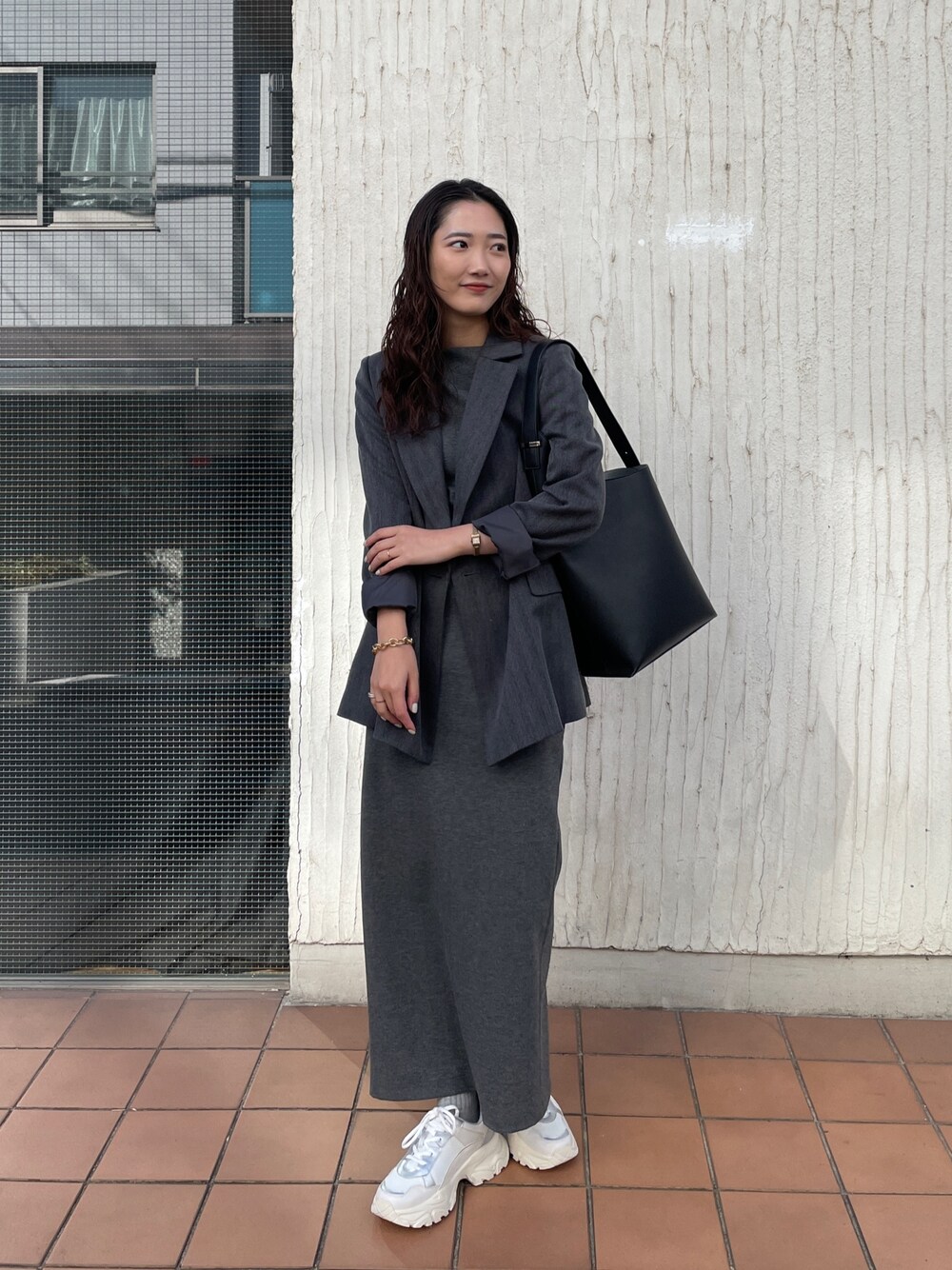 柳橋唯さんコラボ商品! 【ジャケット】ルーズなシルエットがたまらなく可愛いジャケット。お仕事はもちろん、カジュアルなスタイリングでの着こなしが相性抜群!!肌触りも良くストレスフリーで着られます♡ 【ワンピース】こんなにスタイルアップが叶うシンプルワンピースは他にない!くらいにウエストや腰回りのラインを綺麗に見せてくれる一枚。細身ですが伸縮性のある生地感なので安心です。【スニーカー】ラグにムーンオリジナルスニーカー。厚底で今時っぽい大きめシルエットが可愛すぎる!とっても軽いので長時間外に出かける際におすすめです!