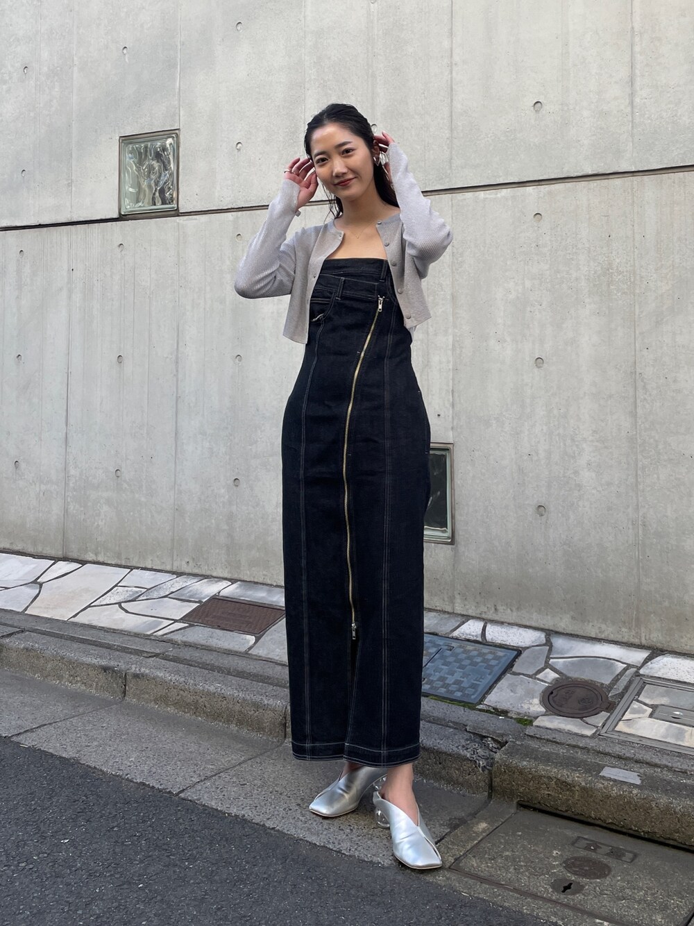 【ニット】着てびっくりするほど柔らかいニットなので程よく体にフィットしてくれる!ほんのりラメが入っているのでシンプルすぎずトレンドを抑えられるアイテムです。【ワンピース】アシメデザインが目を引くデニムワンピース。インナー次第で雰囲気を変えられる一枚です。ベルトでウエストを調節できるので小柄な方でも着やすい!【シューズ】足先にスリットが入ったパンプス。カラータイツや靴下をチラ見せするのがオシャレです