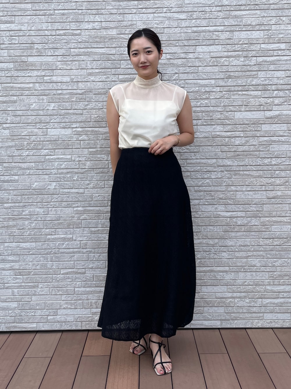 【トップス】メッシュ素材を使用したシアートップス。高見えさせてくれるので上品な印象で着られます。とにかく涼しくて軽い!!♥ 【シューズ】足先にスリットが入ったパンプス。カラータイツや靴下をチラ見せするのがオシャレです!【スカート】ニットで馴染みのいいレーススカート◎。腰回りのラインは全く拾わずにシルエット綺麗に出してくれます。