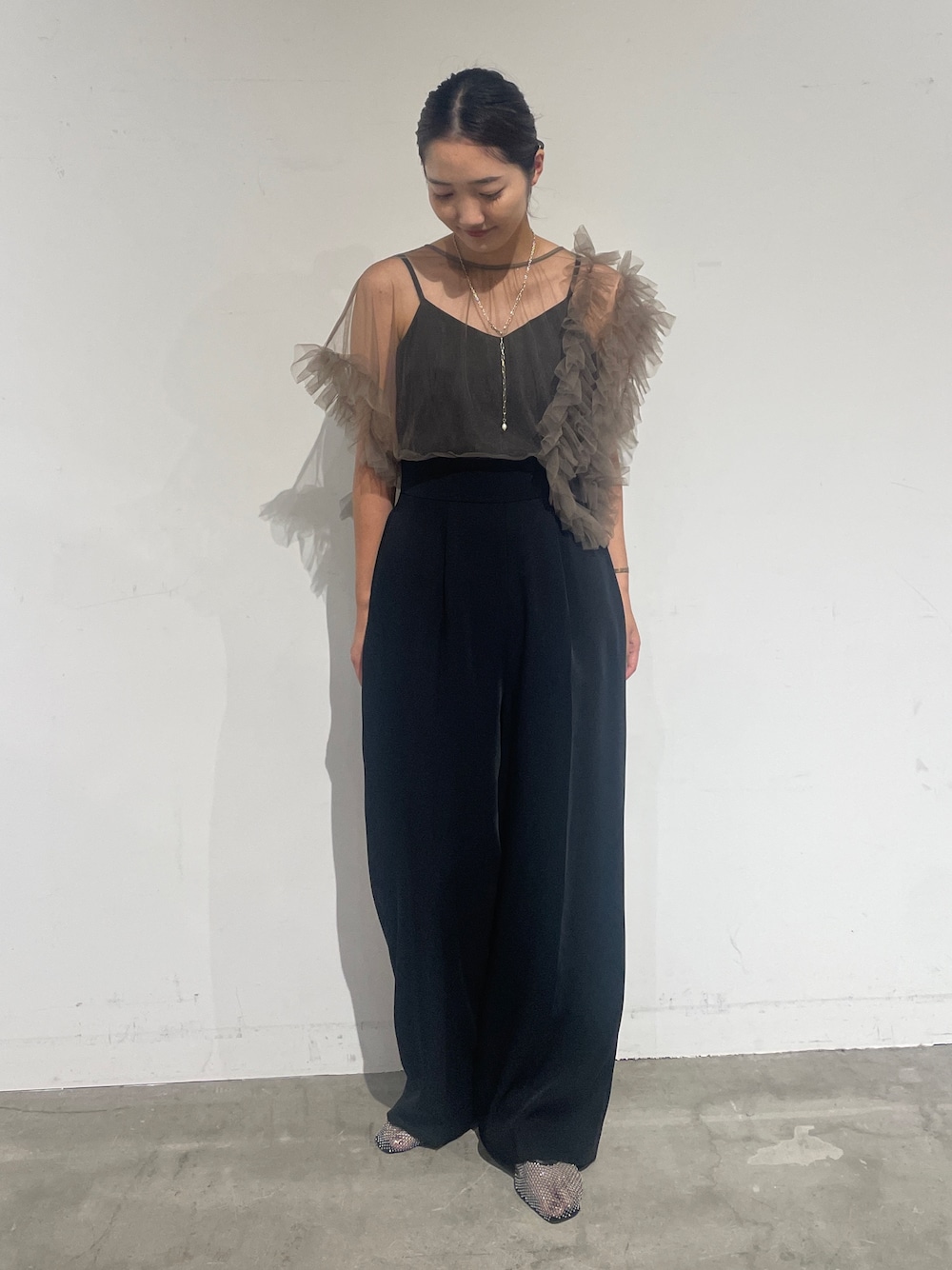 【ドレス】アシンメトリーデザインがおしゃれなパンツドレス。肩のボリュームが程よくあることでメリハリがつきウエストはとても細見えするアイテム!唯一無二のデザインが目を惹きます◎【シューズ】デイリー使いもしやすいラメパンプス。ドレスでは珍しくヒール無しなので普段ヒールを履かない方にオススメのシューズです。