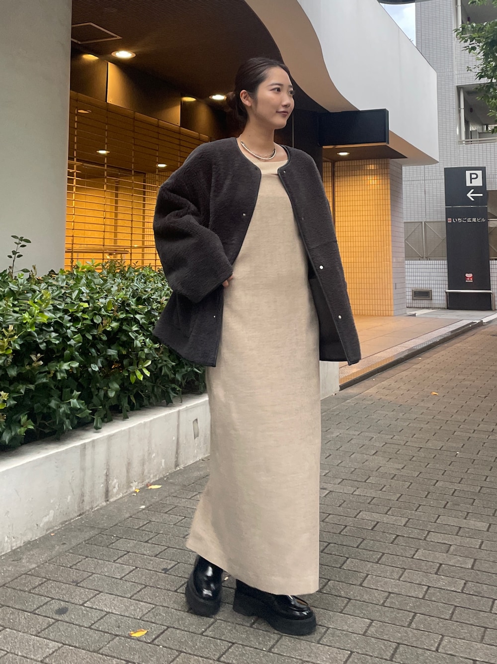 【 ニット】デコルテを綺麗に見せてくれる万能ニット。シンプルながらもドレープデザインが入っているのでシンプルなボトムス合わせでもおしゃれに見せてくれるトップスです。【ワンピース】バックデザインが可愛いキャミソールワンピース。インナー次第で雰囲気を変えられるのでシーズン問わずに着られます!【アウター】リバーシブルのボアコート。ふわふわな柔らかくて軽いボアなのでシンプルながらも高見え◎。厚手のニットも着られるサイズ感なので真冬もお使いいただけます! 【ブーツ】どんなスタイリングにも合わせやすいショートブーツ。丸みを帯びたシルエットが今っぽくてかわいい♡