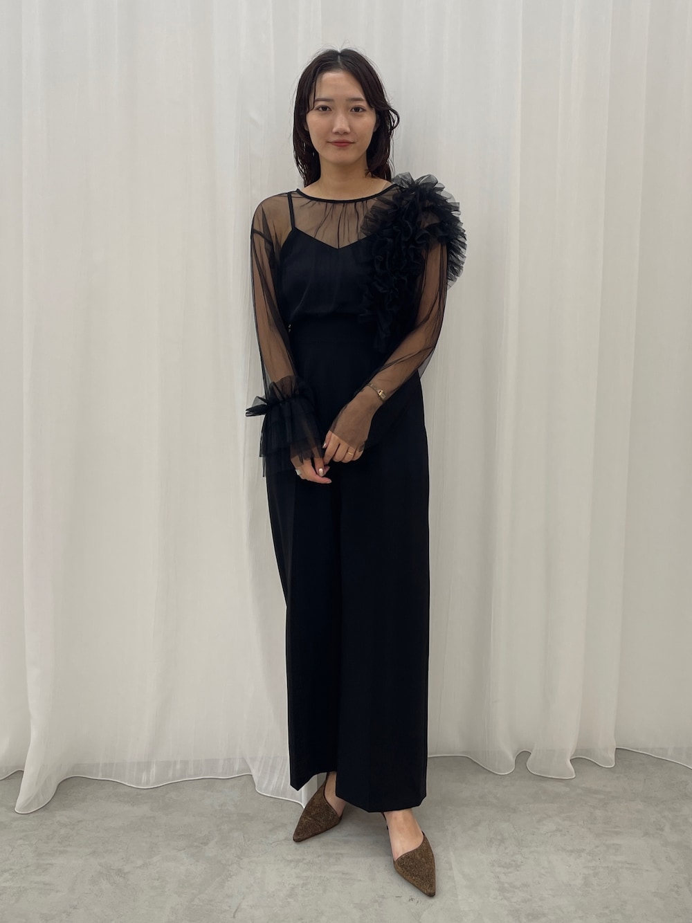 【ドレス】アシンメトリーデザインがおしゃれなパンツドレス。人気のシリーズから長袖バージョンが入荷しました。肩のボリュームが程よくあることでメリハリがつきウエストはとても細見えするアイテム!唯一無二のデザインが目を惹きます◎ 【シューズ】程よく足元に抜け感を出せるパンプス。アシメデザインがおしゃれで目を惹きます!どんなドレスにも合うので一足持っていると安心の一足◎
