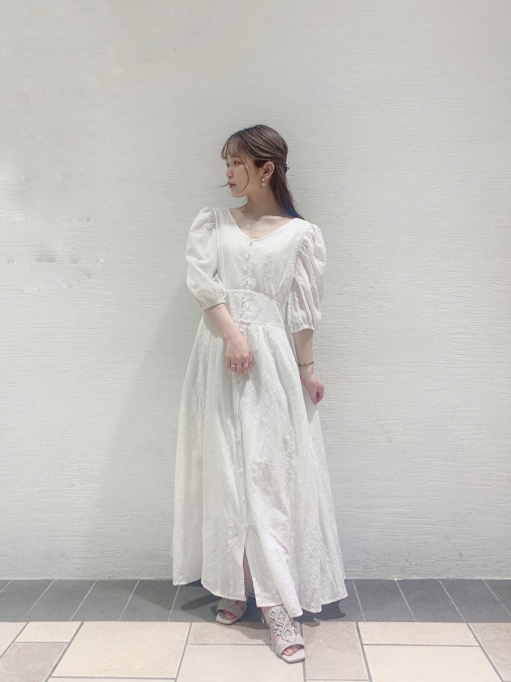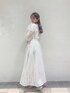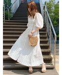こちらのワンピースは、よく見て頂くと小花柄が散りばめられていて、コットンレースの素材になっているのでとても柔らかい華やかな印象を、与えてくれます♡ お袖も肘より少し長めなので、春から秋まで長く着ていただくことができます♪ 真ん中にくるみボタンがついていて、フェミニンな印象になりますが、後ろ姿がポイントになっていて、深めに背中が空いていて、前からの印象とのギャップを演出してくれます♡ あまり露出したくない方は、私のように、インナーを入れて頂いても綺麗に着ていただけます♡ 薄めのシャツやアウターと合わせてもとても可愛いので、私は後ろにプリーツが入ったこちらの長めのまるでトレンチコートのようなシャツを羽織ってみました♡ 足元のクリアヒールのサンダルと、バッグで季節感も夏先取りで合わせていただけます♡