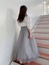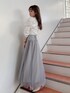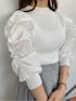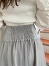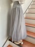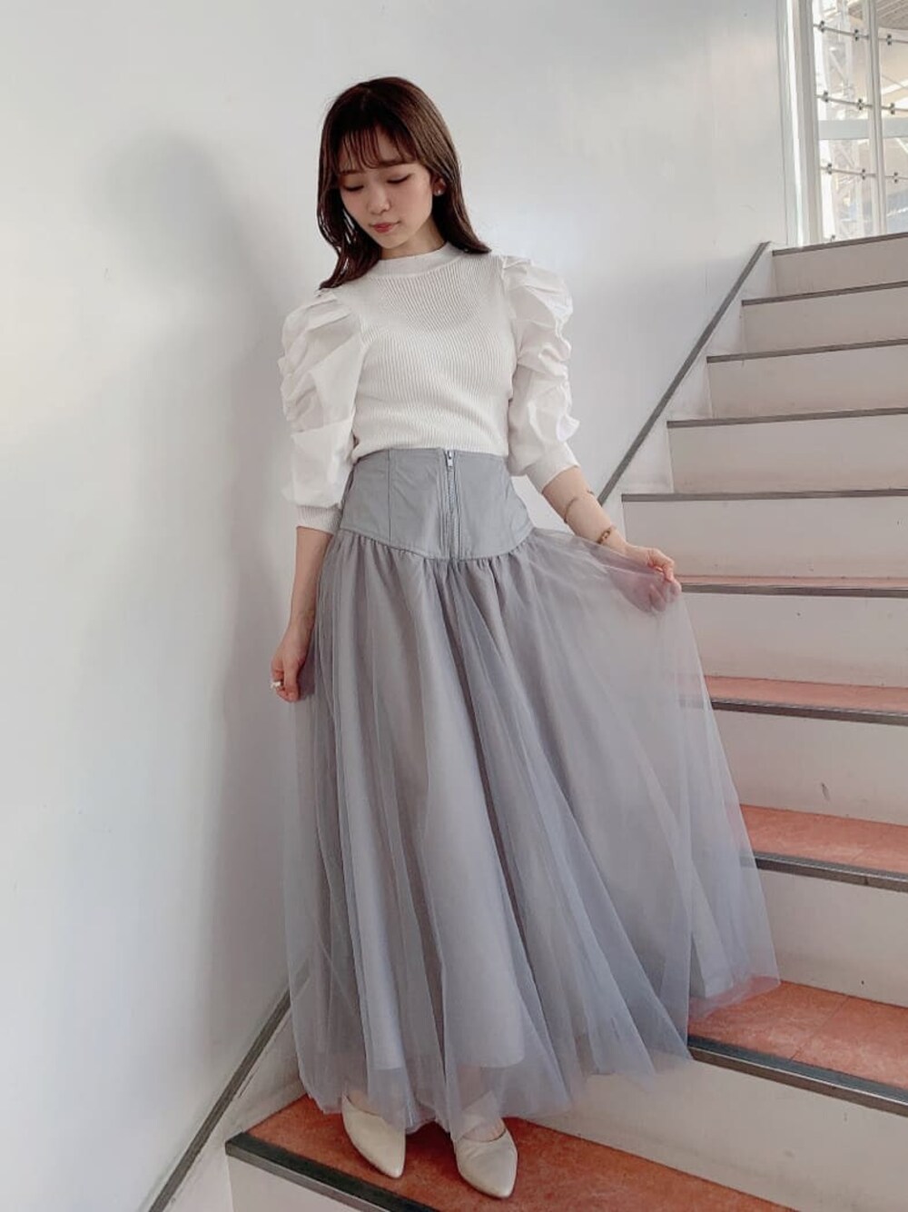 白×チュールで透明感◎ウエストのコルセットでチュールでもしっかり細見えコーデ♡ 【トップス】 少しだけハイネックの薄手ニットの柔らかいニットです。シンプルなデザインで装飾品なども付いていないので、キャミワンピースなどのインナーとしても使いやすいアイテムです。1番のポイントは、お袖のボリューム感! しっかりギャザーが施されているので、パフスリーブとはまた違うボリューム感を楽しめる 1枚になっています◎袖口がキュッと絞られていて、手首がしっかり見える長さなので、細いところをしっかり見せるデザインに。ただボリューム感がすごいだけにならないように華奢見え効果も抜群な1枚に! 【スカート】 チュールスカートなのに、何故か細見えするスカート!その秘密は、ウエスト部分にハイウエストでコルセットデザインになっているからです。キュッとウエストを引き締めてくれ、スカート部分を柔らかいチュールにすることで、さりげなく華やかさもプラス◎ 私はSサイズを着用しているのですが、スカートの後ろ部分にギャザーが施されているので、薄手のトップスだとウエストに少し余裕があったので、太めのニットと合わせても大丈夫そうなサイズ感でした◎
