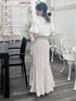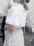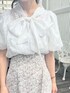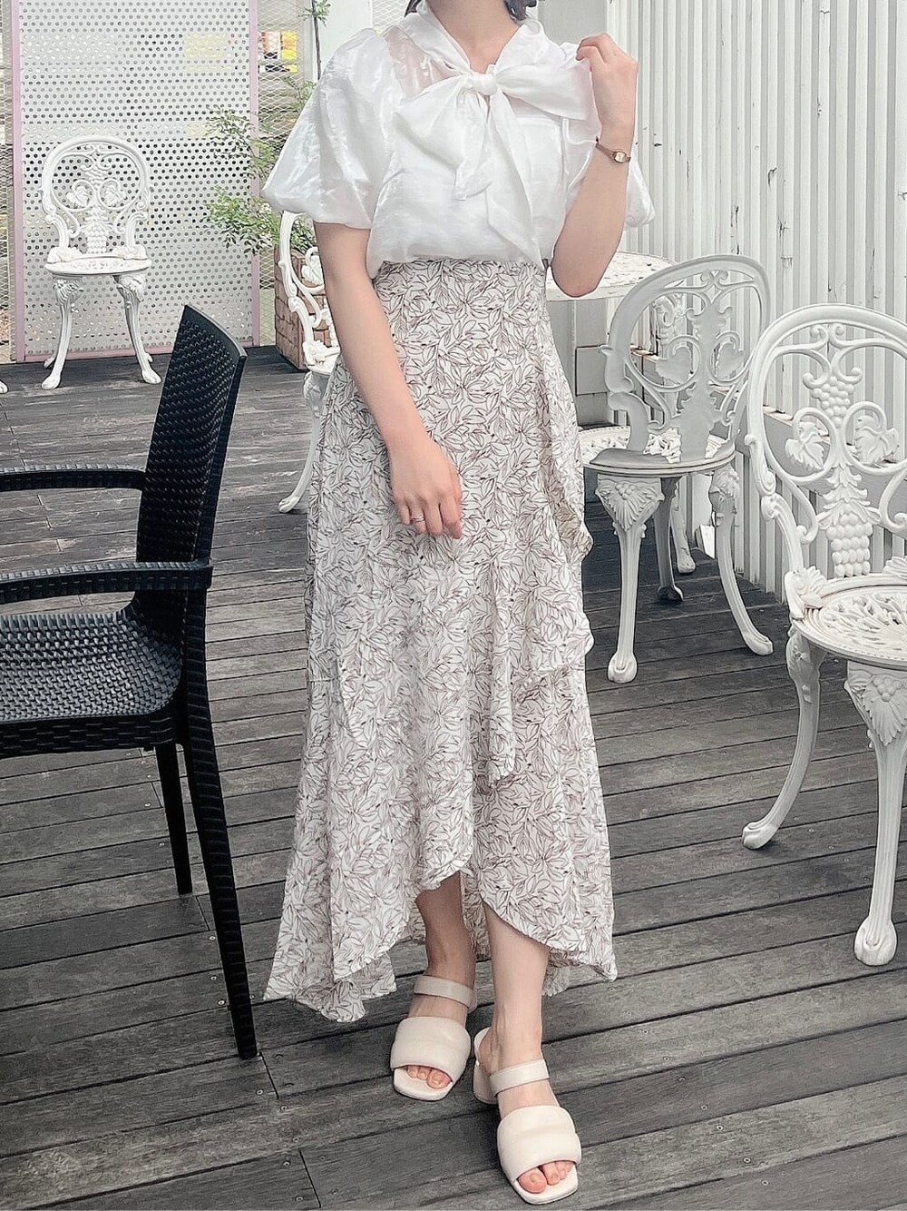 涼しげガーリーオールホワイト夏コーデ♡ 【トップス】 光沢感のあるサラッとした生地のブラウスです。今季トレンドのパフスリーブ×大きめのボウタイが女の子らしさアップで着るだけで一気に旬顔ガーリーコーデになります◎ 少し鎖骨あたりがシアーで透け感になっているので、抜け感も◎ 裏地付きなので1枚で着れます♪ 【スカート】 大きいフリルが目を引くデザインのマーメイドスカートです!柔らかい生地なので締め付け感なく、前が短い丈感になっているので、足首をスッキリ見せてくれます。 サイズ展開もあるので、お好きなサイズ感で選んでいただけます◎ 私はSサイズ着用ですが、153cmで1番短い裾部分は、足首がちらっと見えるくらいでした◎ 【シューズ】 ころんっとした見た目が可愛い♡ 履き心地もふわふわで、まるでマシュマロ! 履いた日から病みつきになる履き心地です♪ ヒールの高さも低すぎず、高すぎずでさりげなく足首を綺麗に見せていただけます!