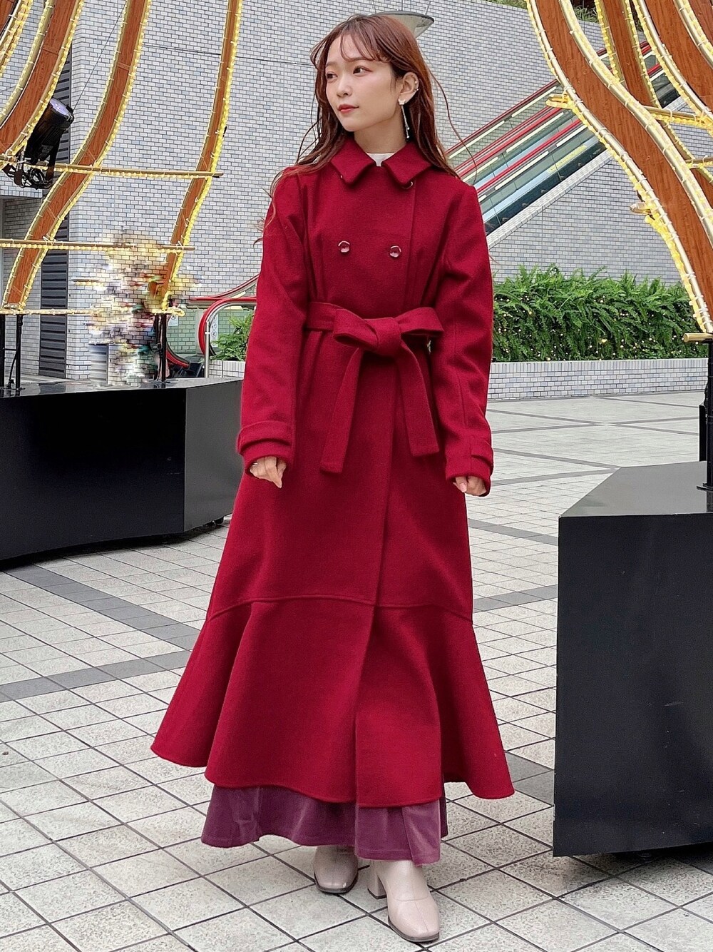 目を引くクリスマスコーデに🎶ワインレッドのコートが主役コーデ🧥🍷 【コート】 マーメイドシルエットになっているロングコートです🎶しっかり防寒できるのに、シルエットが綺麗なので着膨れして見えない✨サイズ展開もS.Mであるので好きなサイズ感を選んでいただけます。裾の切り替えがポイント🫣💕 目を引くワインレッドのカラーで冬も楽しめちゃいます🎄♥️ 【ブーツ】 つま先がスクエアなのがお気に入りポイント♡ピタッと柔らかくフィットしてくれるストレッチショートブーツです。普段22.5〜23cmで、Sサイズ着用です!足首が最初ぴたっとしていましたが、履いているうちに柔らかくなり自分の足に馴染んでくれました♡