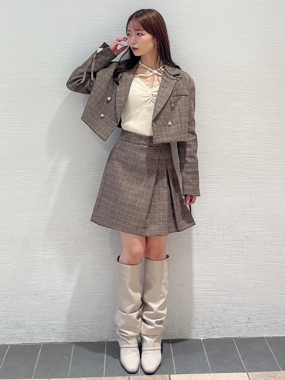 チェック柄のセットアップで大人可愛く、一気に秋らしく🍁ルーズロングブーツは2wayタイプでショートブーツにもなる優れもの✨