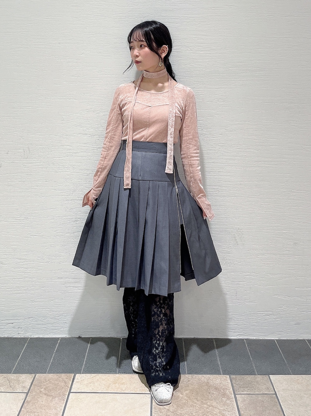 【トップス】タイトなシルエットで形がとにかく綺麗に見えます✨ チョーカーが付いており結び方で雰囲気も変わるのでボトムスで巻き方を変えると🙆🏻♀️ 【スカート】ミディ丈のスカートで1枚で履いても、パンツに重ねてもオシャレに履けます! ジップを開けると足をチラ見せできて抜け感が出ます💫 【レースパンツ】足の部分のみレースの透け感があるので、インナーは見えないので安心して履いていただけます。153cmでSサイズを履くとヒール無しだと少し長いのでシューズはヒールありがオススメです!