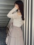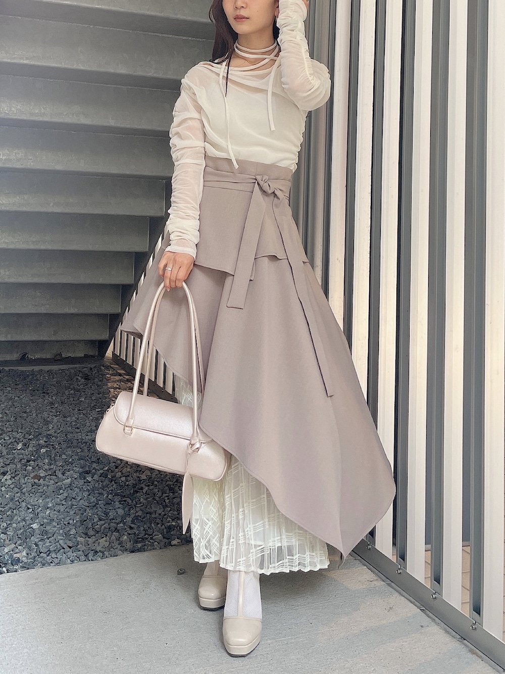 シアーのチョーカー付きのギャザートップスでさり気ない肌見せと、アシンメトリーになってチュールがドッキングになってるフレアスカートの組み合わせで大人可愛いコーデに仕上げました♡