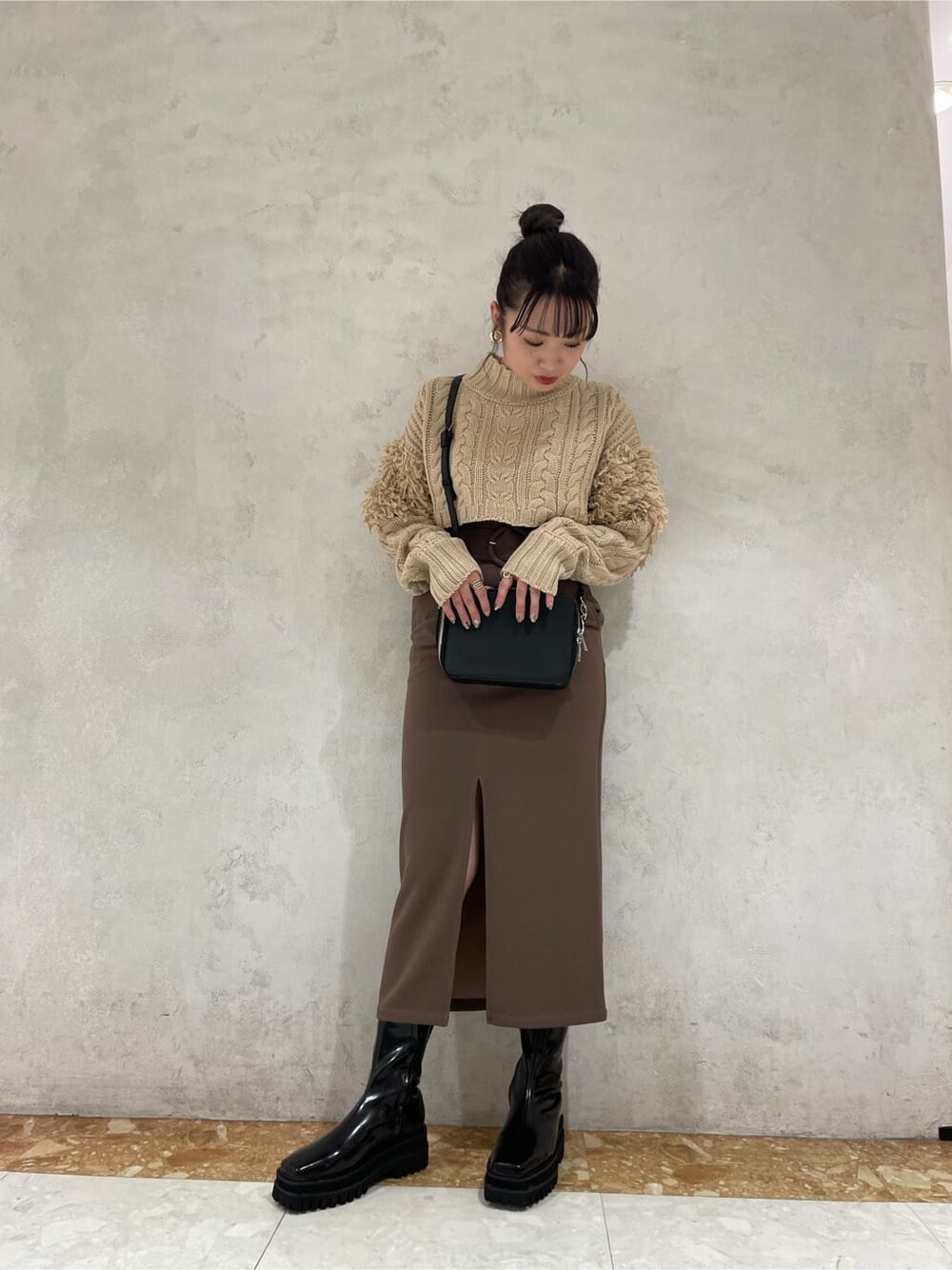大人気のこちらのスカートはとっても伸縮性がありタイトなので女性らしい印象になります! 私はミニ丈のトップスで上品さと秋らしさを出しコーデを組みました!!前に大きくスリットが入っているのでパーカー合わせでもカジュアルになりすぎずにコーデを組むことができるので是非店頭で試着してみてください!!