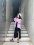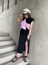 【トレンドキレイメコーデ】夏でも黒着たい!けど暑苦しく見えがちなんでピンクのシャツを巻いても着ても可愛い夏らしいコーデにしました! スカートもスリットがはいっていてウエストがゴムなのでとっても通気性あって楽にはいていただけます!