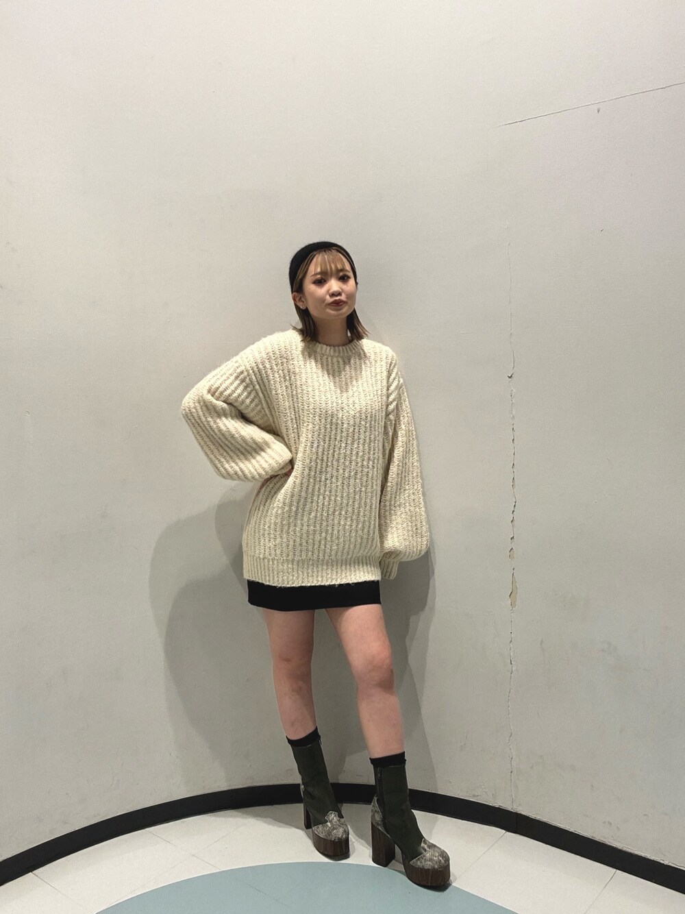 【カジュアル楽ちんコーデ】 【TOPS】オーバーサイズニットなのでお尻まで隠れる丈感なのでゆったり着ていただけます! 【BTMS】ハイウエストのミニスカートなのでインして履いてもスタイルアップになるのでオススメです!