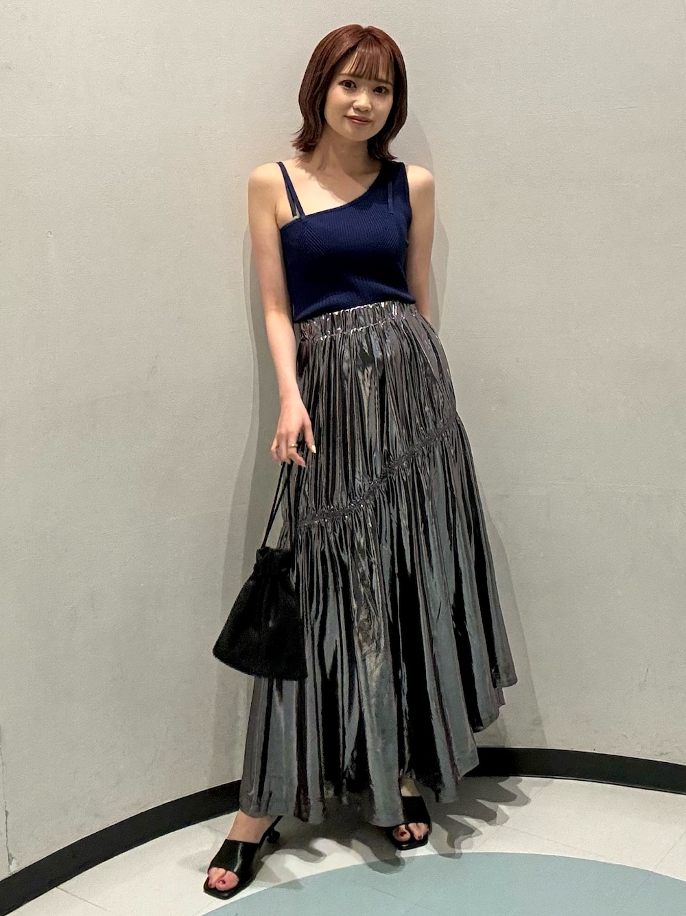 【キレイめモードコーデ】 【TOPS】こちらのトップスはぴたっとしたニットなのでインナーとしても使える!左右非対称のトップスなのでオシャレ感たっぷりです! 【SKIRT】アシンメトリーになっており1枚で存在感抜群!153cmの身長でこのくらいの丈感になっております!