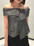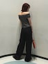 【キレイめ楽ちんコーデ】 【TOPS】オフショルで華奢に見えるトップス!デザイン性ありストライプ柄なので縦ラインきれいに見えます! 【PANTS】透け感あるパンツは夏にピッタリで裏地も膝上までなので黒でも重たく見えないです!