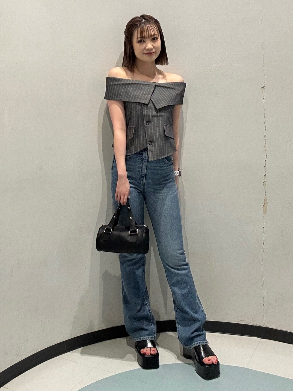 【TOPS】ストライプのオフショルトップスは華奢に見せてくれます♡デニムやワイドパンツでボトムカジュアルでも可愛いです!1枚でオシャレ見えしますよ! 【PANTS】MURUAのデニムは履いてびっくり細見え間違いなしです!サイズ展開も豊富でピッタリで履いて頂けます!私は153cmの身長でSサイズを履いてます! 【BAG】流行りのBAG♡たくさん入れて頂けてBLKでも形変わっていて存在感あって可愛いです! 【SHOES】パンツスタイルに相性抜群の厚底サンダル!とても軽く疲れにくいです! 24cmの足のサイズで真ん中のサイズ23.5をピッタリで着用しております!