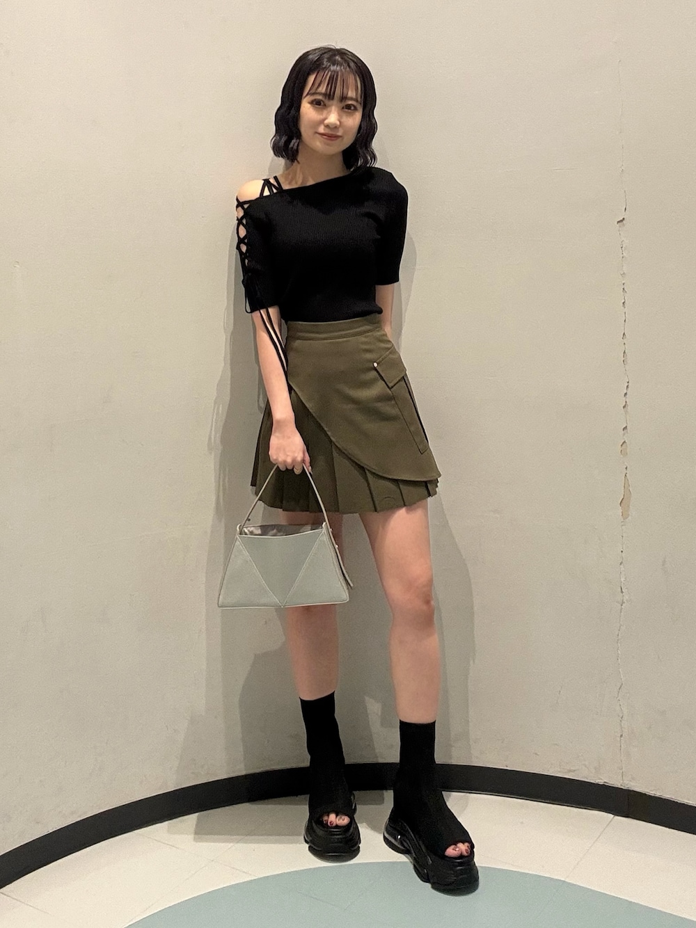 【TOPS】片方がレースアップになっている女性らしいトップス♡首元から斜めになっていて首詰まってるの苦手な方は鎖骨も出てスッキリ着れるのでおすすめです!丈感もしっかりインして頂けます! 【SKIRT】こちらのスカートは巻きついているデザインでくっついているのでこのまま履けます!Aラインで足を細く見せてくれます! 【SHOES】エアソールになっていて足首まであるシューズなのでミニ丈合わせにはありがたいです!24cmの足のサイズで23.5を履いています! 【BAG】形を変えて使えて2wayでイメージ変えて使えるので万能!ペットボトル入れれる大きさになります!