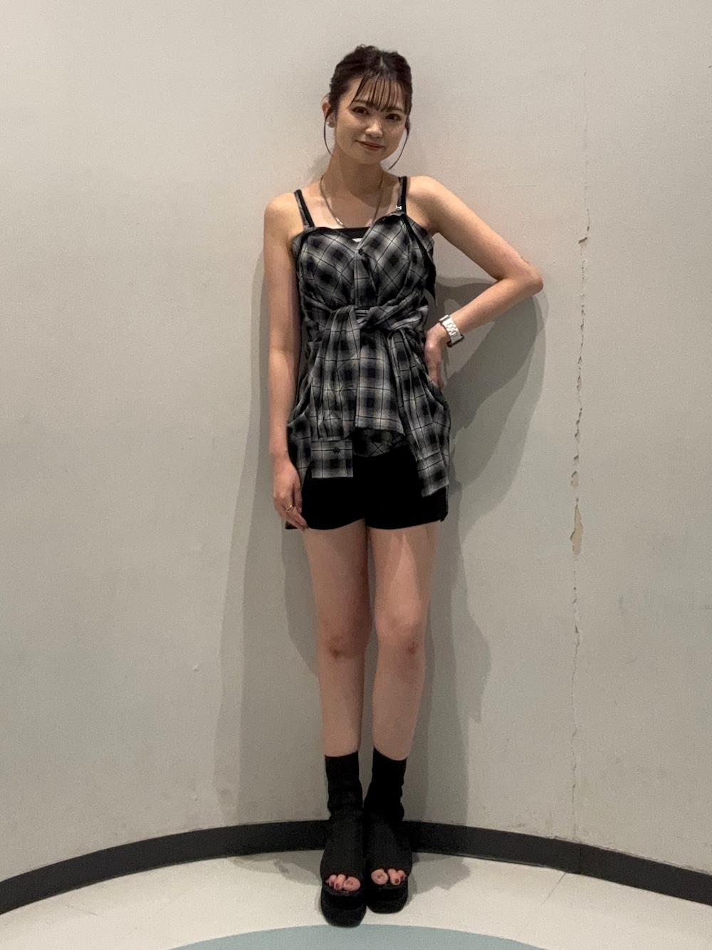 【TOPS】こちらのトップスは3wayで使って頂けるので秋もシャツとして使えちゃいます!袖でウエストを絞れるようになっているのでウエストの位置を高く見せてくれます!スラックス合わせでも可愛いです! 【PANTS】オールシーズン使えるショートパンツ♡タックが入っているのでピッタリしすぎてないので足の形もきれいに見えます! 【SHOES】MURUAで大人気のシューズ!メッシュ素材なので真夏でも履けちゃいます!10cmのヒールの高さですが軽すぎて長時間でも余裕で履けます!24cmの足のサイズで23.5を履いています!