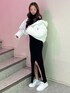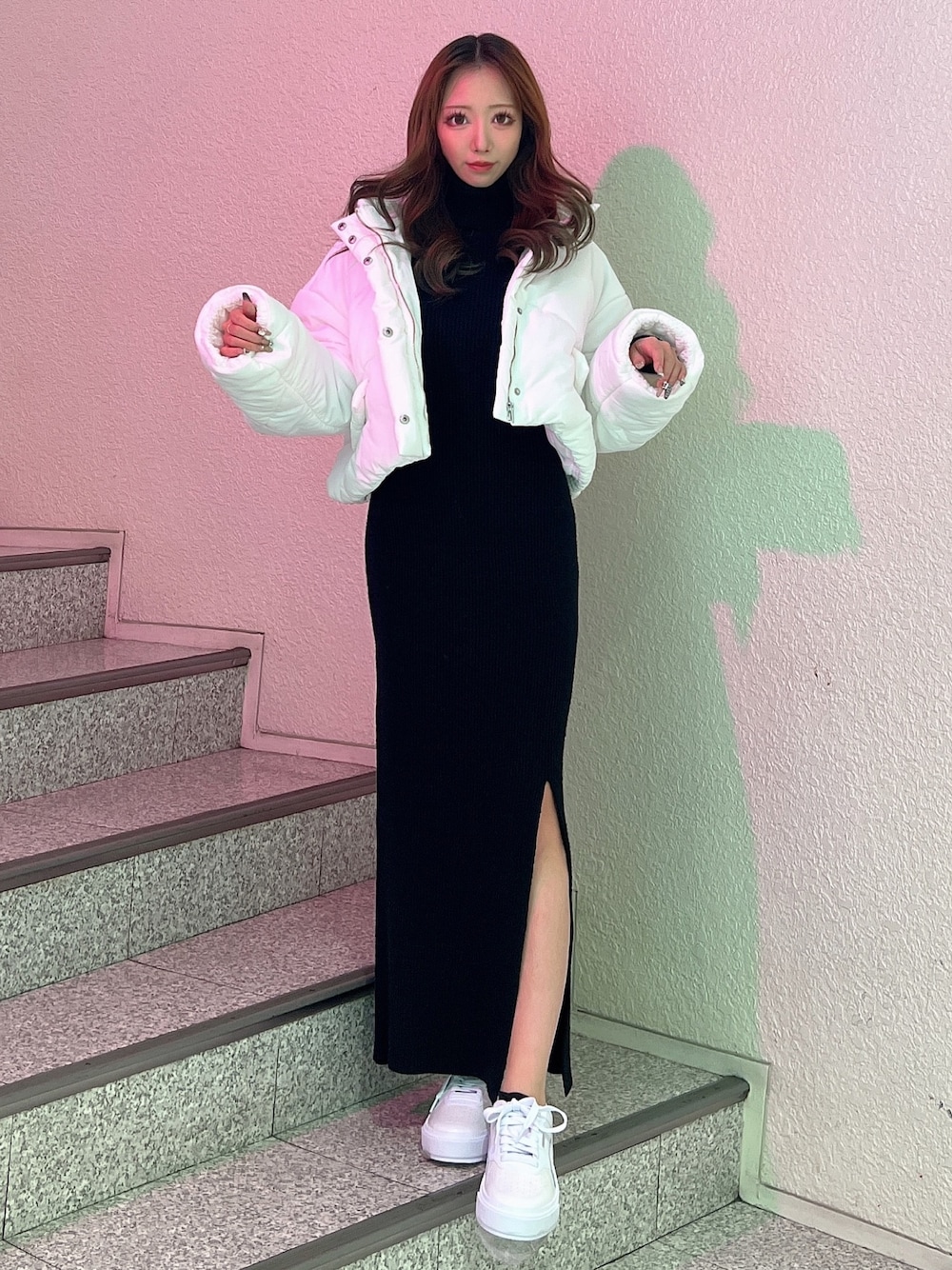 ブルゾン→機能性中綿のブルゾンの為、暖かく軽いのがポイントです♡ 中に着込む事ができますしふんわりとボリューム感が可愛いです!丈は長すぎず、短すぎずでどんなコーデにもぴったりです! ワンピース→程よくボディラインに沿うタイトワンピース。 スリットが膝まで大きく入っているので女性らしく抜け感のあるデザインです。 柔らかく伸縮性の良いニットでストレスフリーな着心地です。 シューズ→ カジュアルになり過ぎないよう、パテント加工が施されていてどんなアイテムやコーディネートにもマッチ。 ソールもしっかりしており歩きやすく、3.5センチの厚底になっています♪