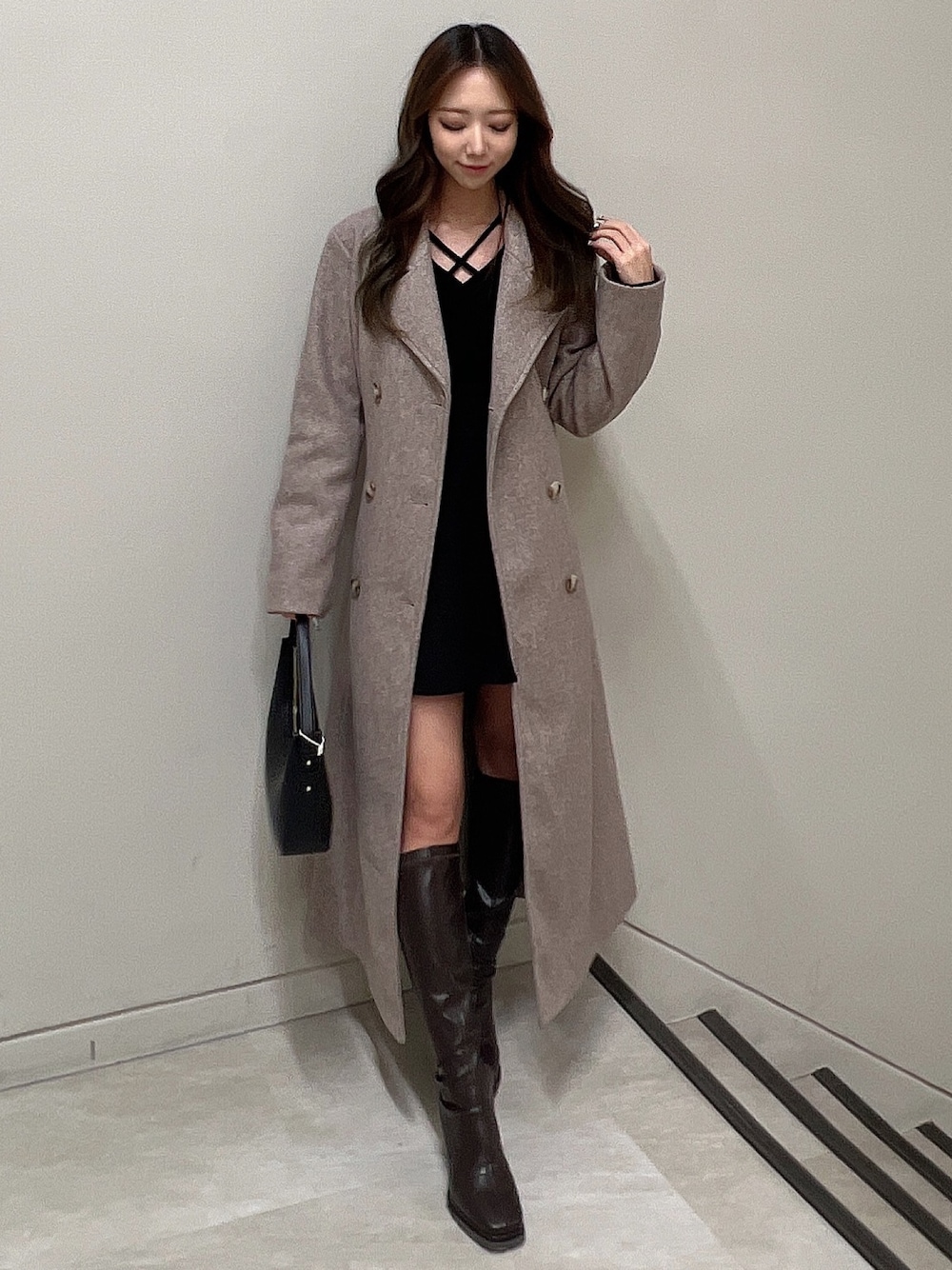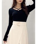 コート→下にかけてフレアになっているデザインなのでウエストラインも綺麗に見えます。高めの位置にベルトがある為スタイルアップ抜群♡ 暖かくどんなコーデにも合わせやすい一枚です。 トップス→リブの生地なのでピタッとしており細見え効果◯ クロスデザインでデコルテもスッキリ綺麗に見えます! ボトムス→ 前はスカート、後ろはパンツの異なるデザインながらも丈を気にせず着用できます! フロントのラップデザインが太ももラインをスリムに魅せ、脚長効果抜群です☺︎ バッグ→トレンドの三日月型のハンドバックで、付属品も少なく高級感あるシンプルな作りになっています! ブーツ→ ピンヒールですが傾斜が少なく楽に履いていただけるミドル丈のブーツ。脚に沿ってピタッとしたシルエットで細見えも抜群です!