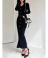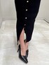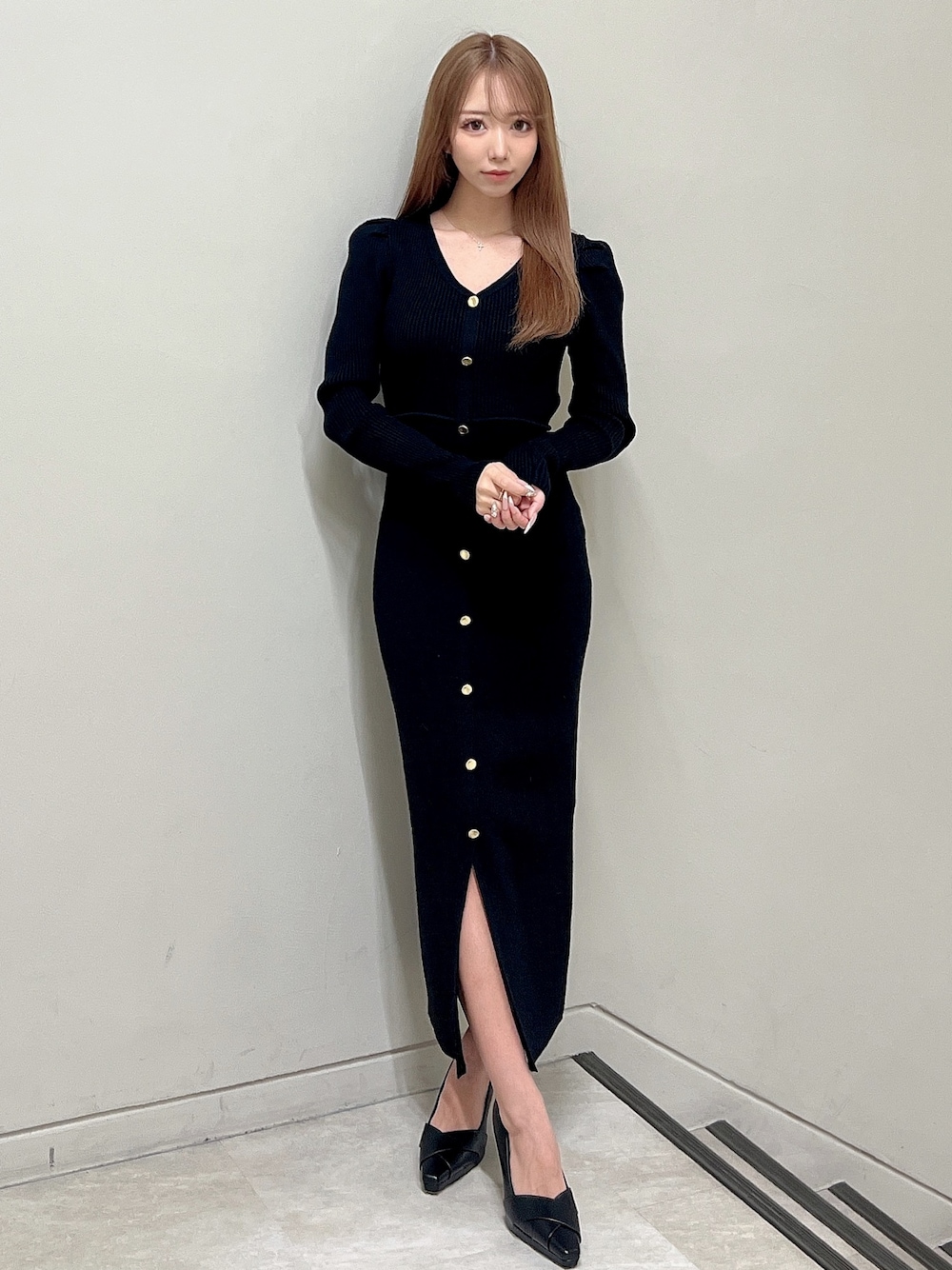 ワンピース→リブ素材のニットなのでピタッとボディラインを綺麗に出してくれます。バスト下に切り替えラインがあることで脚長効果もバッチリです♡ 前にスリットが入っており程よい肌見せ& ゴールドボタンが華やかな印象になります。 シューズ→クロスデザインでスタイリッシュに仕上がったパンプス。着こなしを選ばないベーシックなデザインなので、オンオフ問わず幅広いシーンで活躍します♪