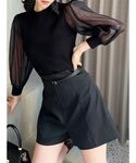 トップス→クロップド丈の綺麗めブラウス❤︎ 襟×ゴールドパーツで大人っぽい雰囲気に。チェーンは取り外し可能です! パンツ→ハイウエストのシンプルなショートパンツ。後ろのウエスト部分はゴムになっており楽に履いていただけます♪ 薄めの素材なのでこれから長く使えます! バッグ→コンパクトなサイズ感とシンプルなデザインでどんなコーデにも合わせやすいアイテム。 ゴールドの装飾xツヤを抑えたバッグで高級感もあり華やかに! ブーツ→厚底で歩きやすさも抜群!! メッシュ素材がこなれ感もありミニ丈との相性バッチリ!