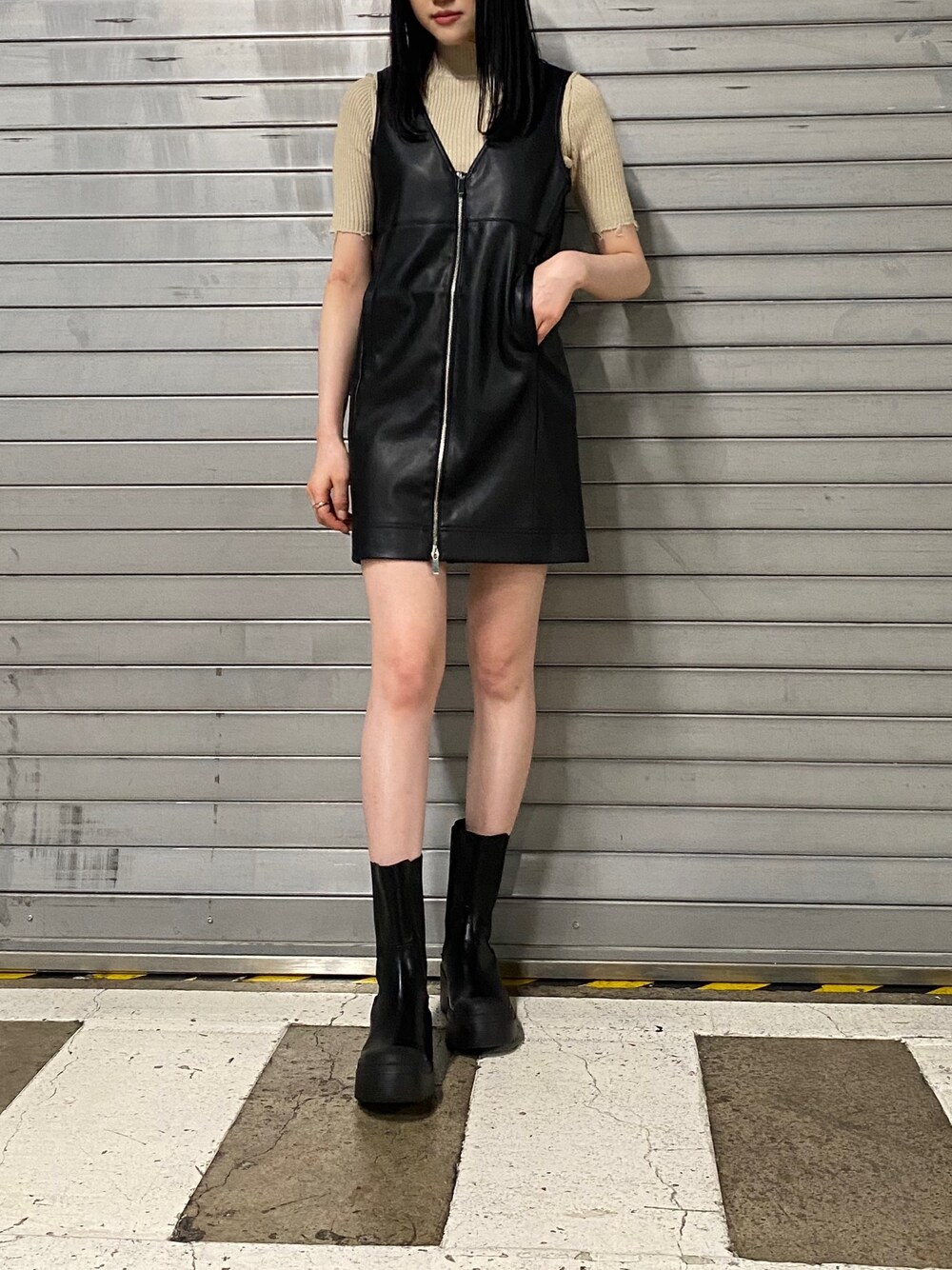 【トップス】クラッシュデザインが目を惹くトップスで、ラメ入りなのがとっても可愛いです! 【ワンピース】レザー×ZIPでモード感がとても出るワンピースです! 【ブーツ】Lサイズ着用。