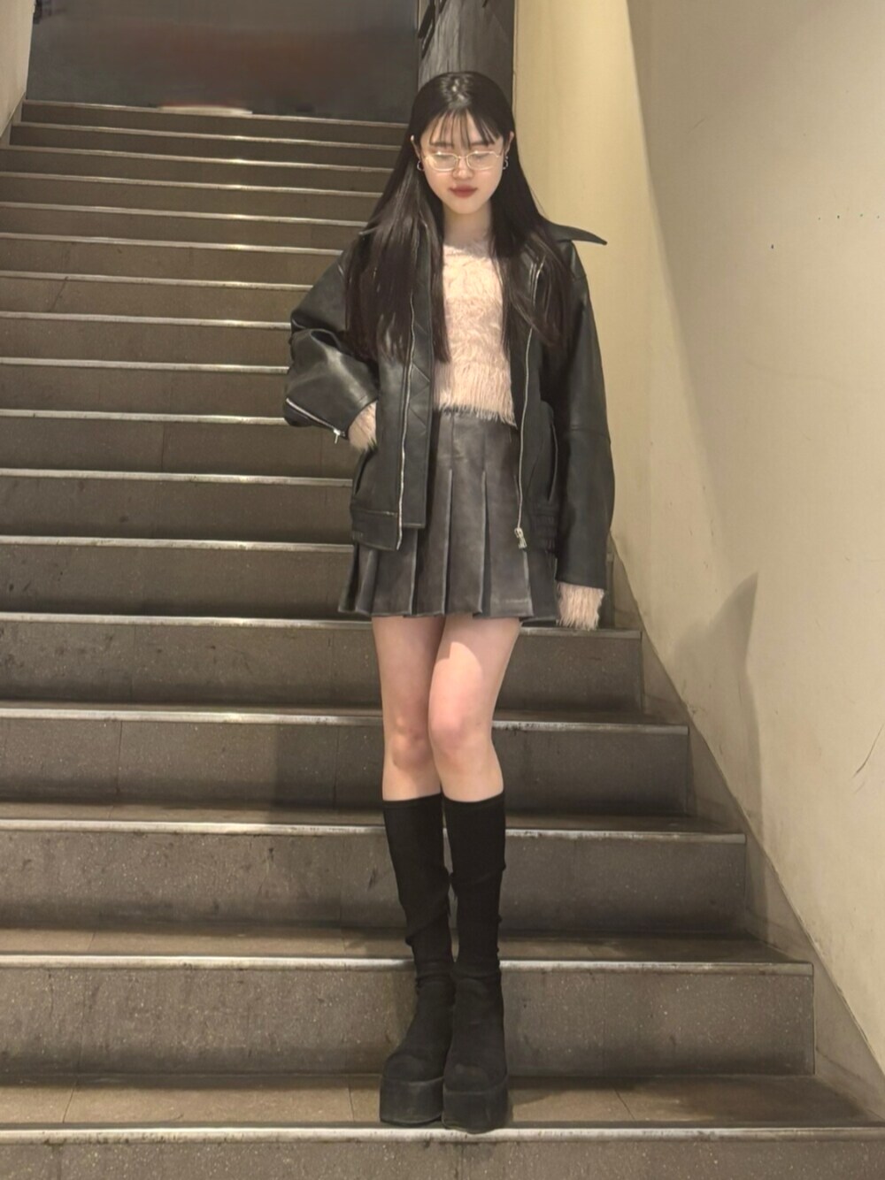 【アウター】 ヴィンテージ感のある今期らしいレザーブルゾン! 丈感は165㎝でお尻隠れるくらいで、お尻辺りにボリュームがあって可愛いです! 【ニット】 大人気のラメニット!小さいスパンコールが沢山付いていて太陽などに反射してキラキラ光るのがとっても可愛いです! Vネックでもラウンドでも着れる前後2wayタイプになっています! 【スカート】 ヴィンテージ感のあるレザープリーツスカート!少しハードな印象がある為、シャギーのニットのようなふわふわしたニットなどに合わせて甘辛コーデにするのがオススメです! 【ブーツ】 165㎝で普段24.5ですがLサイズが丁度よかったです!