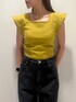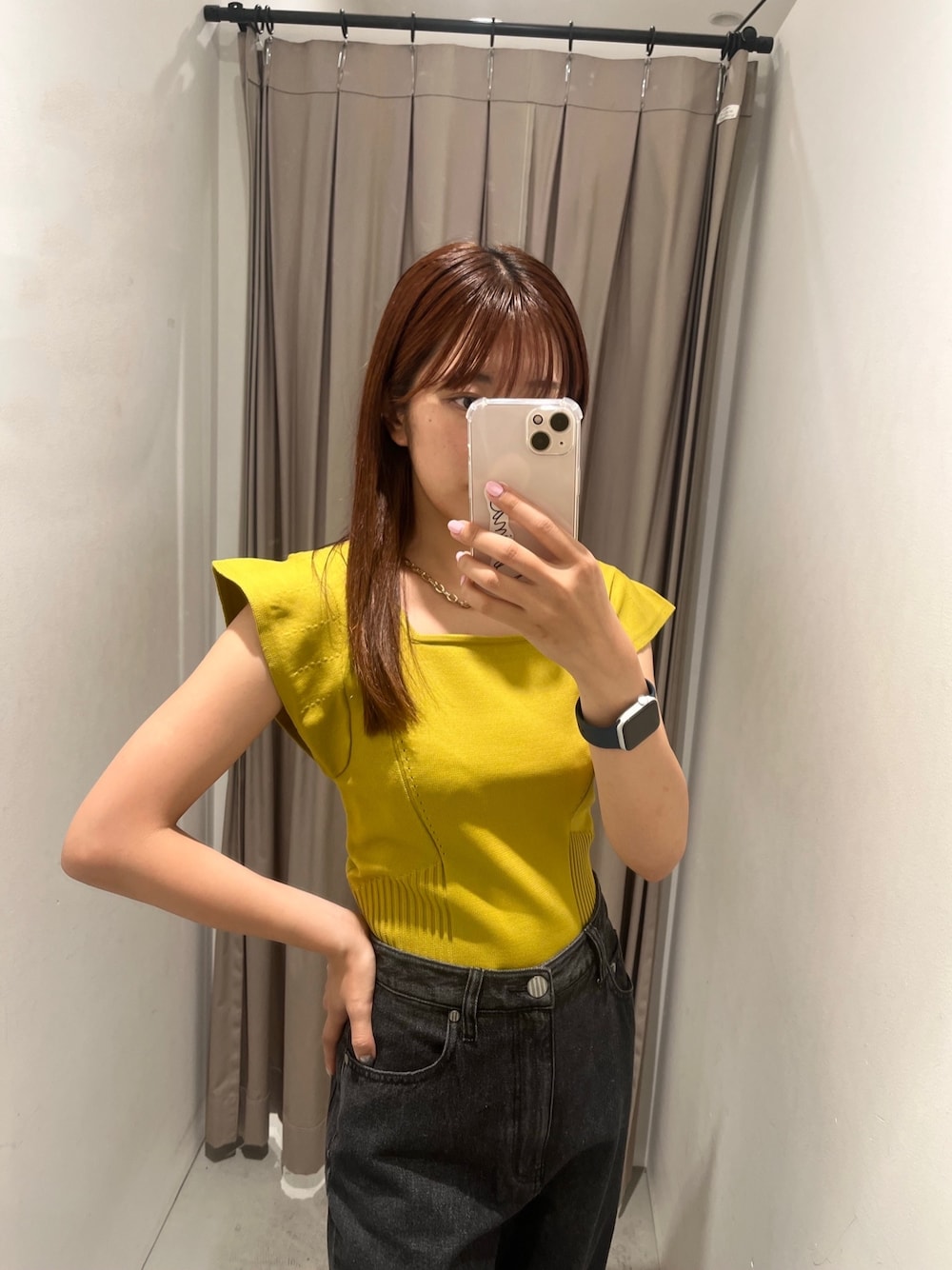 【tops】ドライタッチな素材が着心地の良いニットタンク。フリルの袖で肩周りも華奢見えします!横から見ても脇の部分からインナーが見えない構造なので、安心して着れます◎ 【pants】ダボっとしたメンズライクな着方が可愛いストレートデニム。ハイウエストで気になるヒップ周りをカバーしてくれるので美脚効果も!
