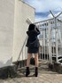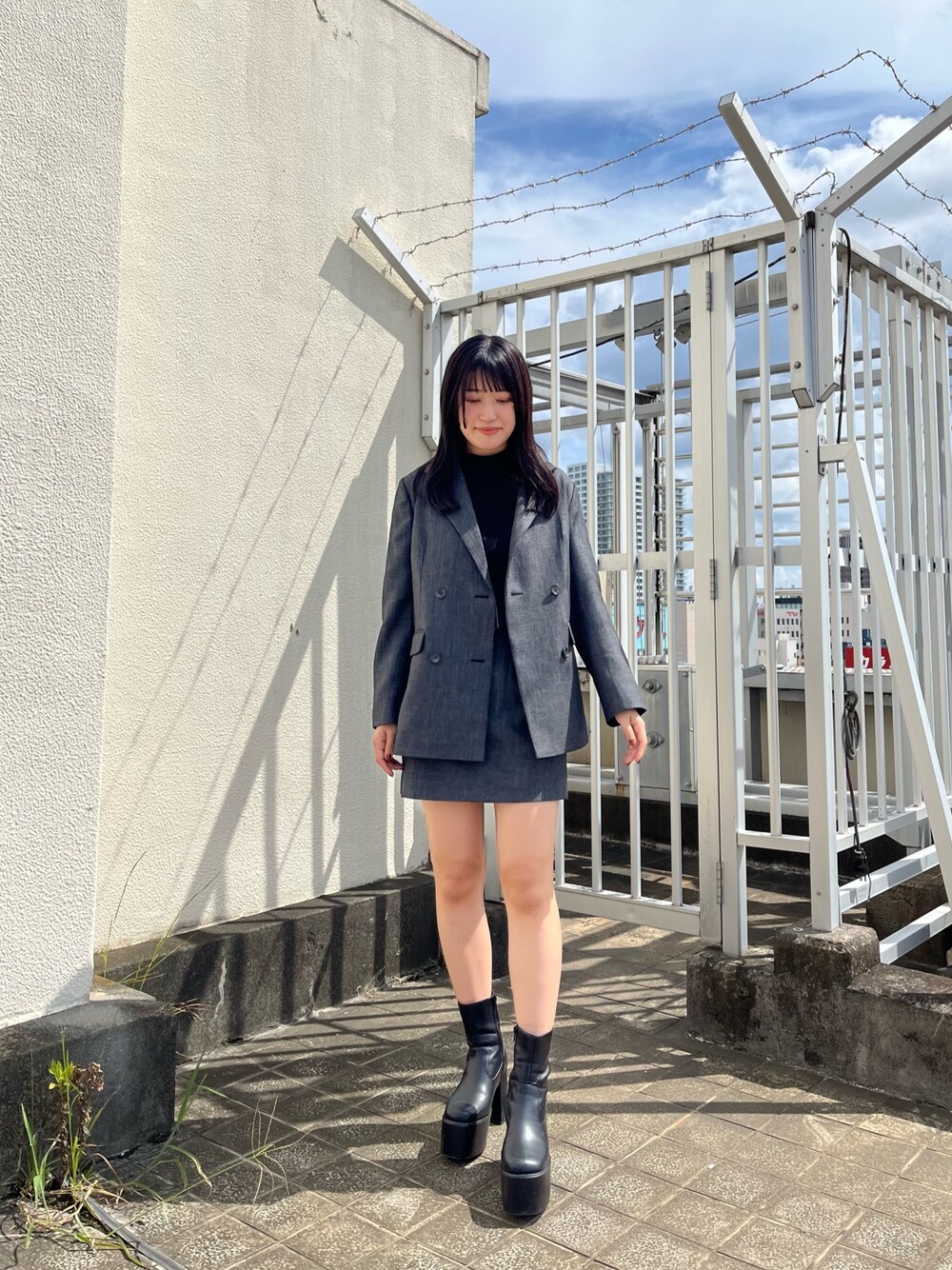 【jacket】肩周りもオーバー過ぎずすっきりしたシルエットなので、綺麗めに着たい方にもオススメ。生地感もしっかりしているので高見えします♡ 【bottom】ジャケットとセット対応のミニスカート。ハイウエストで腰回りのシルエットがかなり綺麗なので腰の位置が高く見え、脚長効果も!内側はショートパンツになっているのでミニでも安心して履けます。 【shoes】しっかり厚底で盛れますが、傾斜が少ないので1日歩いても疲れにくいです!