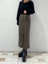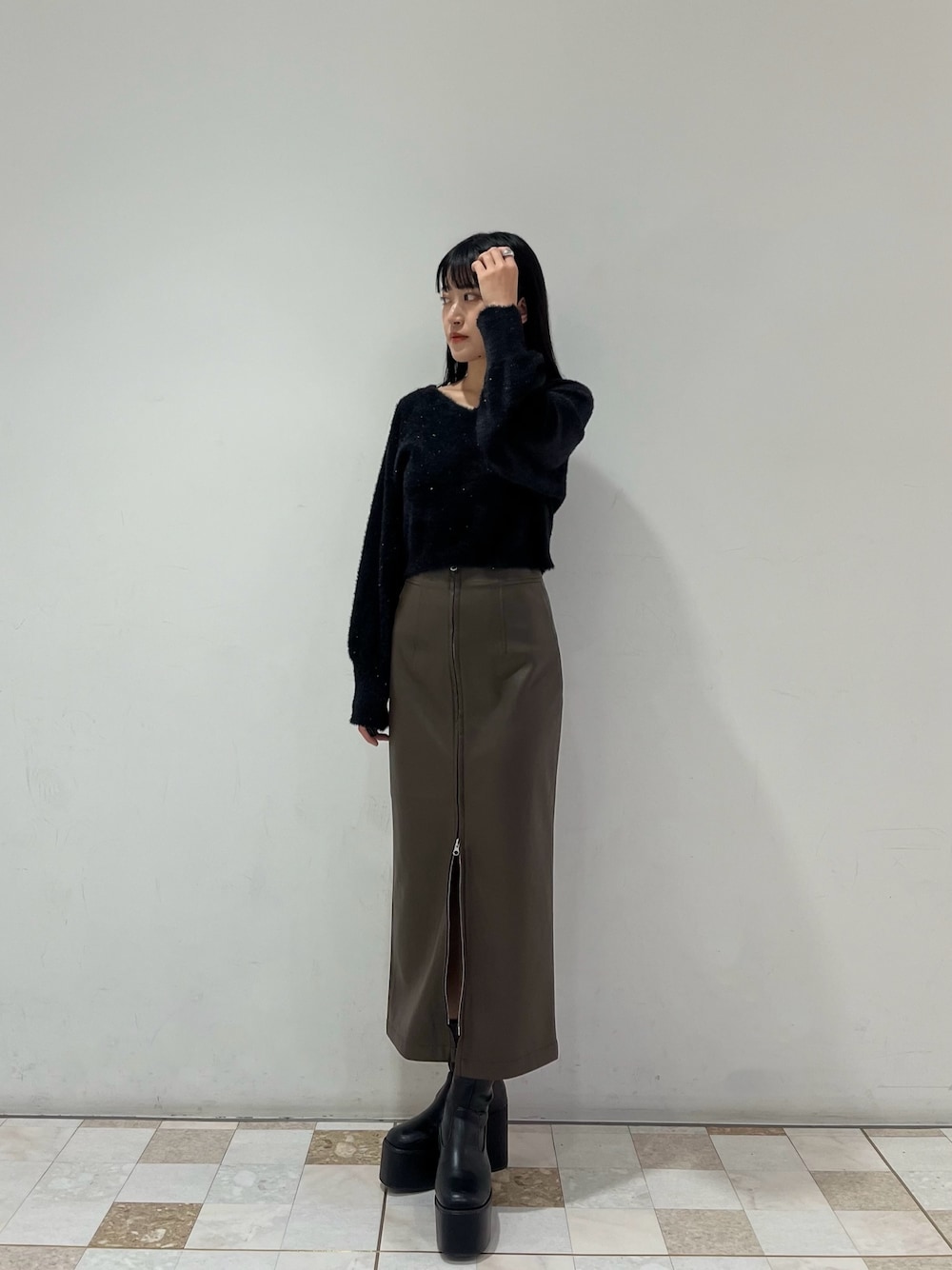 【knit】 前後2wayで着用可能なニット。 ラメがしっかり入ってますが柔らかいのでチクチクせず1枚でも着用出来ます! ブラックは黒いラメ入りなので、さりげなくキラキラするのが可愛い♡ 【skirt】 ジップスリットの位置が前後左右好きなところで着れちゃう万能レザースカート。 かなり柔らかいので、ペンシルタイプのレザーでもかなり動きやすいです。 好みの深さにスリットを加減できるのも◎