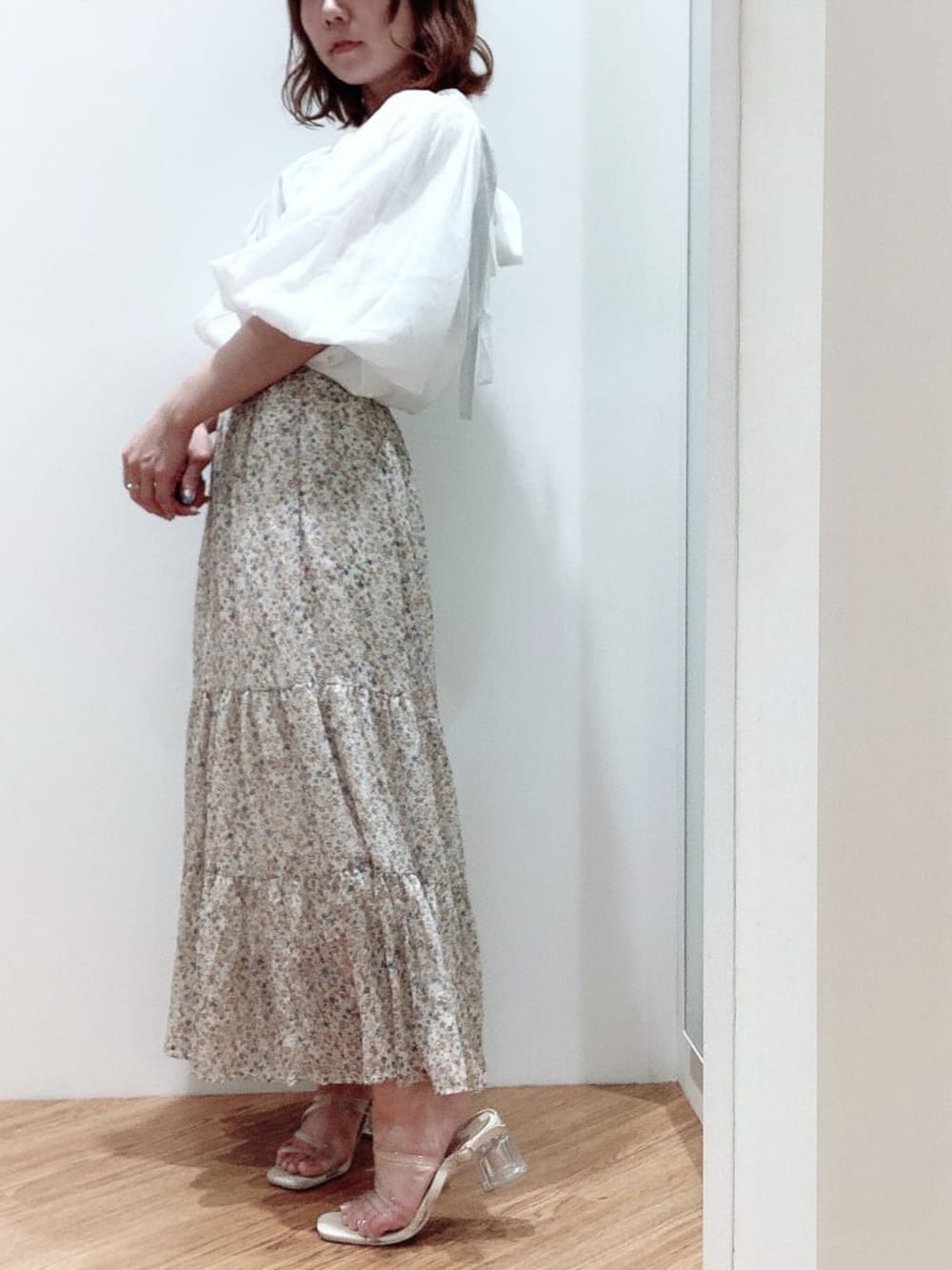 ふんわりコーデ✿ᵕ̈*【トップス】パフスリーブだけど甘すぎず上品に着こなせます。デニムパンツも合わせやすいですよ( ¨̮ )【スカート】ふんわりとした印象にしたかったので、MIXにしました!女性らしくしたい時はD.MIXがおすすめです!【シューズ】クリアサンダルで透明感アップ!