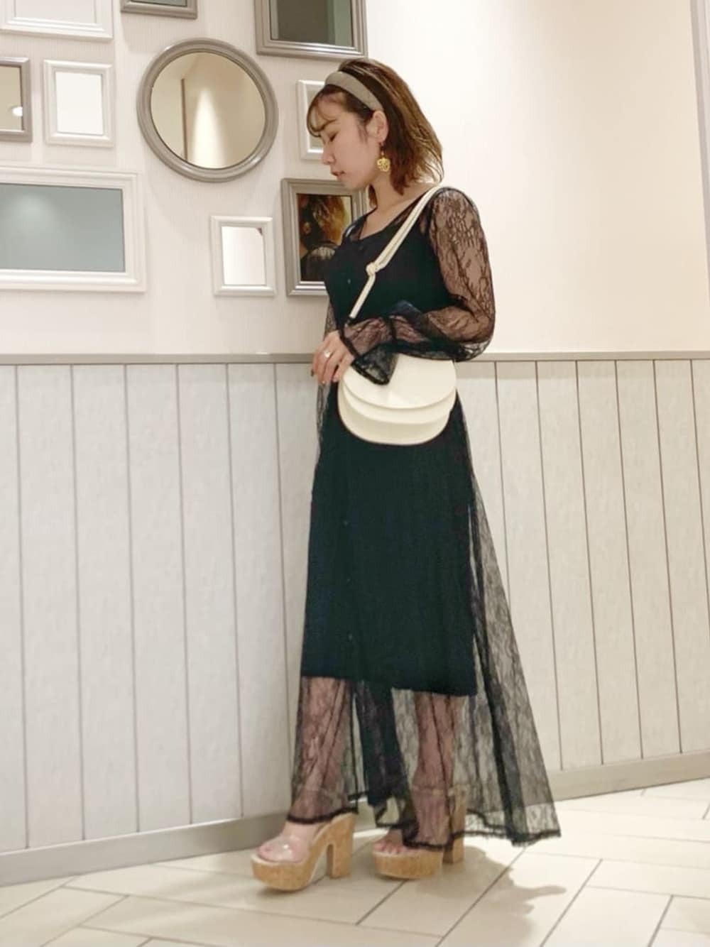 美術館デートコーデ( ¨̮ )【ワンピース】総レースで品がるワンピース。丈は150cm以下だとヒールがマストです!インナーは丈調節出来ます。145cmで1番縮めた状態です。インナー別々に出来るのでキャミ+デニムでレースレイヤードもおすすめコーデです(*´`)【小物】重たい印象にならないようバッグは白でベージュのカチューシャを付けました。【シューズ】クリアのコルクヒールで清涼感と大人っぽさを出しました。