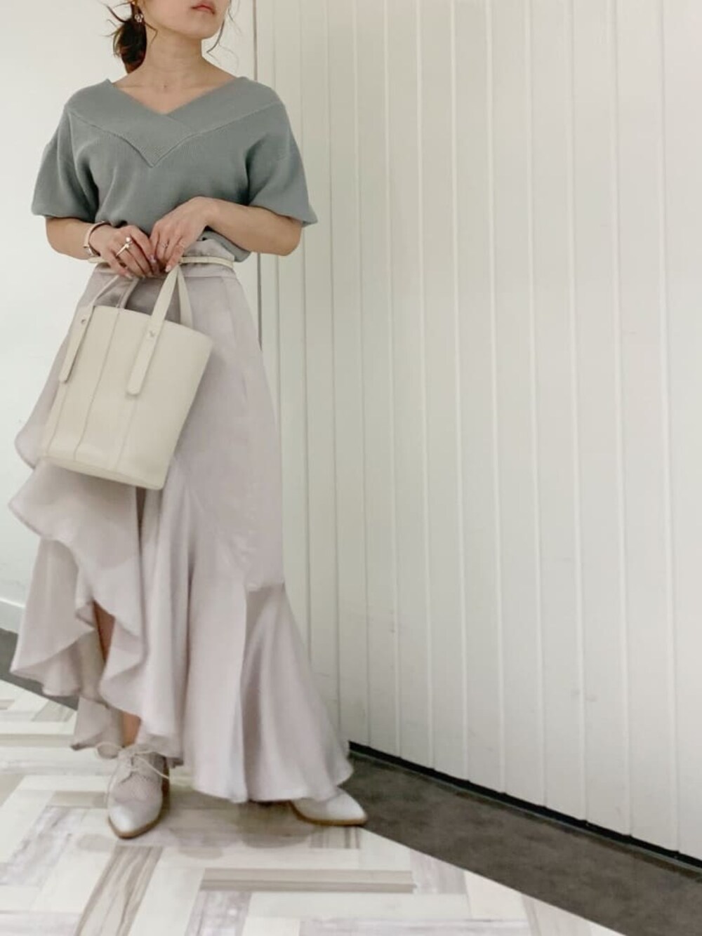 綺麗めカジュアルコーデ。光沢のある素材でフリルデザインのスカートをカジュアルダウンさせました◎【トップス】dazzlinでは定番のデザイン( ¨̮ )夏バージョンで帰ってきました!少しだけパフスリーブなので腕細効果あり◎【スカート】フリーサイズなので、ウエスト緩めなので、普段Sサイズ低身長さんはベルトマストです。丈は前が短いのですっきり着れるのでシューズ色々楽しめます( ¨̮ )