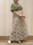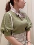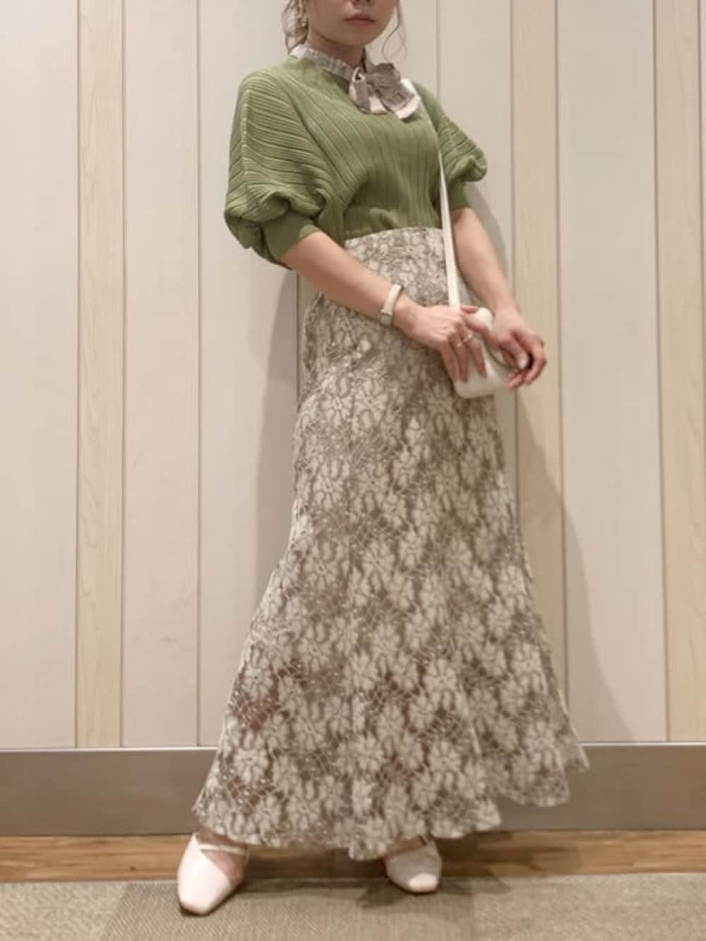大人可愛いカラーコーデ( ¨̮ )【トップス】今期らしいグリーンにしました𓈒𓂂◌𓏸スカーフで華やかな印象に。パフスリーブのリブも袖だけ横地なので腕周りスッキリ見せしてくれます!【スカート】ベージュ/Sサイズ着用。145の私でも安心な丈感でした( ¨̮ )立体的で大きめな柄のレースなので、ボディーライン拾いすぎず綺麗に着れますよ♡♡【シューズ】普段22.5~23.5の私でMサイズ着用。ストラップで調整可能なので少し大きくてもしっかりホールドされて履き心地◎外反母趾の方でも足が痛くなりにくいです!