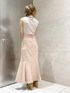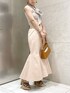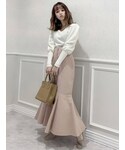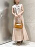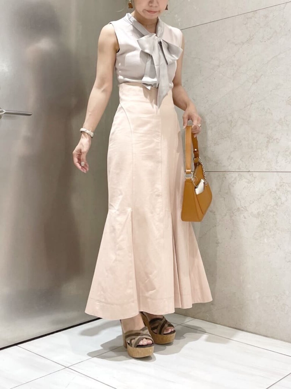 ON/OFFもいけるコーデ【トップス】ツヤ感のあるボウタイリボンとシャリ感あるニットが涼しいトップスです。太めなリボンですが、首元がスッキリ出るのと、ニットでノースリーブなので大人っぽく着こなせます。【スカート】Sサイズ着用。145の私で足首隠れるくらいですが、6cmくらいのヒールでも引き摺らず、綺麗に履けました!ピンクならON/OFFで使いやすいです。