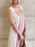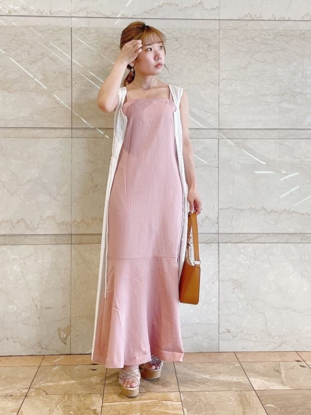 ゆる甘コーデ【ワンピース】大好きなピンクにしました。全体ピンクにすると少しくすんだ感じになったので、クロシェ編みのトップスをジレとしてコーディネートしました( ¨̮ )低身長さんでもゆるっとメリハリが出るコーディネートです。【シューズ】夏らしくクリアがおすすめです!