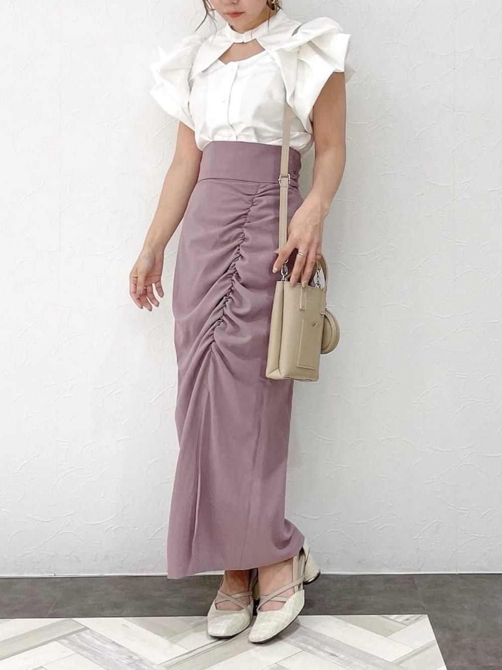 お仕事でもデートでもおすすめコーデ【ブラウス】袖にボリュームがあるので二の腕を細く見せてくれます。デコルテの開きもインナーは見えないのでインナー気にせず着れちゃいます!【スカート】Sサイズ着用。145cmのわたしでくるぶし隠れるくらいでした!低身長が履けるタイトでスリット入ったスカートなかなか出会えないのでおすすめです( ¨̮ )