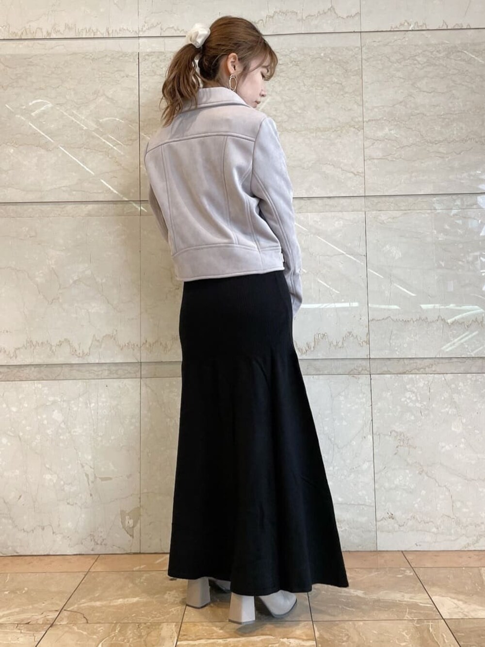 【アウター】黒ワンピなのでかっこよくなり過ぎない淡色を選びました。柔らかいスウェード素材で肌なじみがいいです!Fサイズで145の私だと袖丈が手の甲隠れるくらいになります。 【ワンピース】Fサイズで145の私で足首隠れるくらいで短めです! 【シューズ】22.5~23.0でSサイズ着用