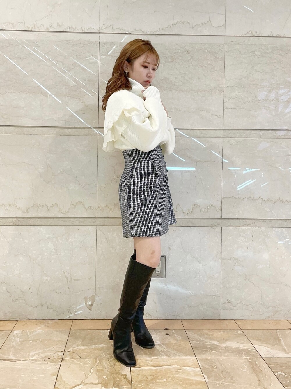 【トップス】ケープカラーが大き過ぎず、肩にふわっとかかるので厳つくなりすぎず着れます。ハイネックなのでしっかり暖かく着れます。【スカパン】Sサイズ着用。145の私でも太ももがしっかり出て、普段Sサイズ緩い方ですが、こちらはしっかりハイウエストで履けました。【ブーツ】Mサイズ着用。22.5~23.0