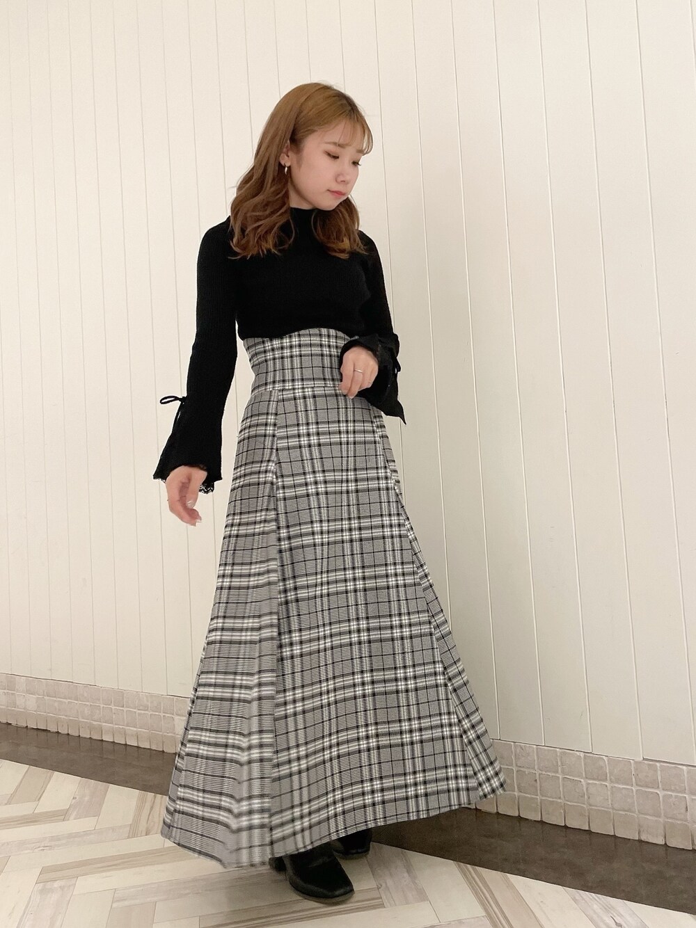 【トップス】タイト過ぎないスッキリしたニットです。ワンピースっぽく見せたかったのでこちらのニットにしました!ヘムレースなので手元が女性らしく可愛いです!【スカート】Sサイズ着用。丈は145で足首隠れるくらいです。ウエストはレースアップなのでSサイズ普段緩い方でもハイウエストの位置で綺麗に着れます。【シューズ】Sサイズ着用。22.5~23.0