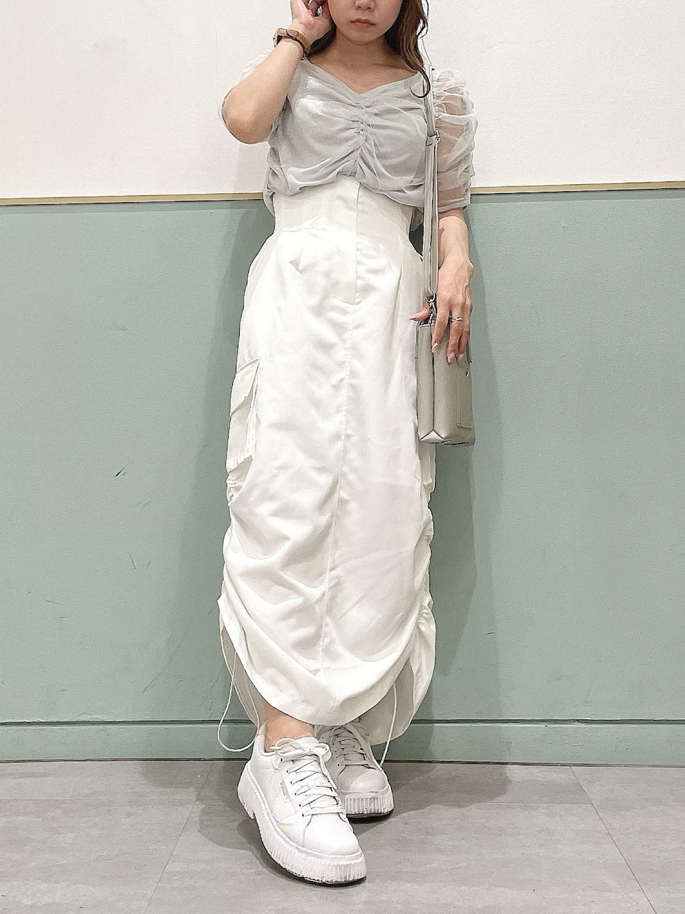【トップス】トレンドのギャザーがたっぷり入った一枚。ラメ入りのチュールもこれだけかなりオシャレ度あがります!チュールの生地が柔らかいので敏感肌な方でもチクチクせずきやすいと思います!【スカート】Sサイズ着用。145cmでも引き摺らないです!裾が絞れるので、足首も出せます!後ろもスリット入ってるのでかなり楽ちんです!