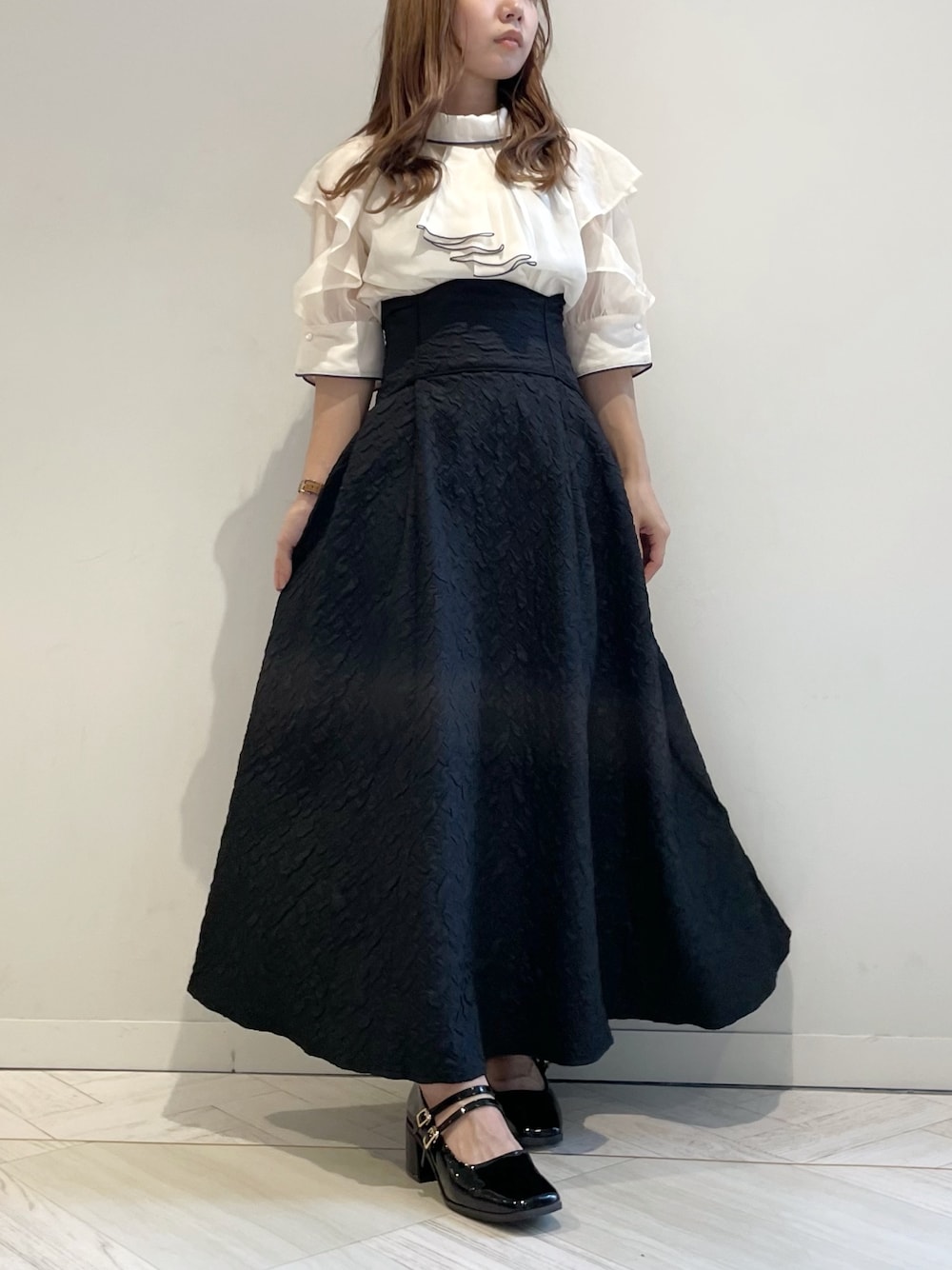 【ブラウス】タイデザインなので顔周りにボリュームあるのが苦手な方でもスッキリ着やすいです。秋はジャケットのインナーに着ても◎首元もゆったり目なので、普段首詰まり苦手な私でも気になりませんでした!【スカート】Sサイズ着用。145cmで普段XSサイズの私で、丈はくるぶしくらいで、ウエストはレースアップしっかり目に絞れるのでハイウエストで履けます!柔らかいジャガードなので重くなく着やすいです。【シューズ】Mサイズ着用。足のサイズ22.5~23.0/外反母趾の私でもつま先部分広めで履きやすく、ヒールも低めなので、高いヒール苦手な方でも歩きやすいです。