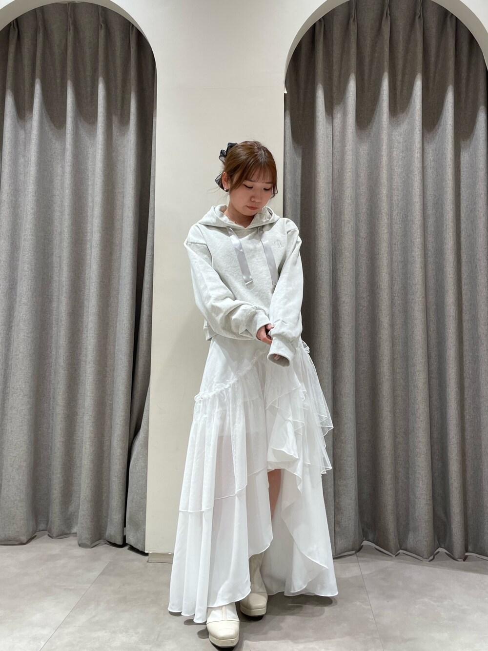 【トップス】Fサイズ着用。145センチだと丈はおへそ下で袖も長めでゆったり着れました。低身長のかでもボトムスで合わせても着回ししやすいと思います!【スカート】Sサイズ着用。普段XSサイズの145センチだとウエスト少し緩く丈もヒール履いても長めでした。前の短い部分は膝上くらいです!150センチ以上の方ならヒールで着れそうです!【シューズ】Mサイズ着用。足のサイズ22.5~23.0/普段Sサイズなので気持ち大きめですが、足首ホールドされてるのと中にクッション入っているので歩きやすいです!