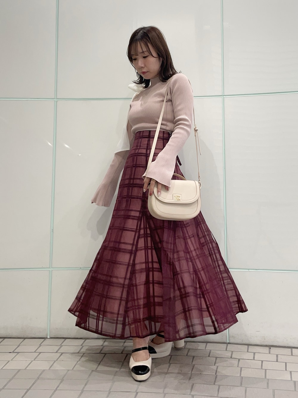 冬まで着れるあざとコーデ♡ 【トップス】Fサイズ着用。ワンショルなので露出苦手な方にもおすすめです! 優しいピンクなのでコーデ組みやすいです◎ 【スカート】Sサイズ着用。145cmでくるぶし隠れるくらいでした。ウエストは普段XSサイズの私にはゆったりめでしたが、レースアップで絞れるので、着られてる感なく着用出来ました◎ 【シューズ】Mサイズ着用。足のサイズ22.5~23.0