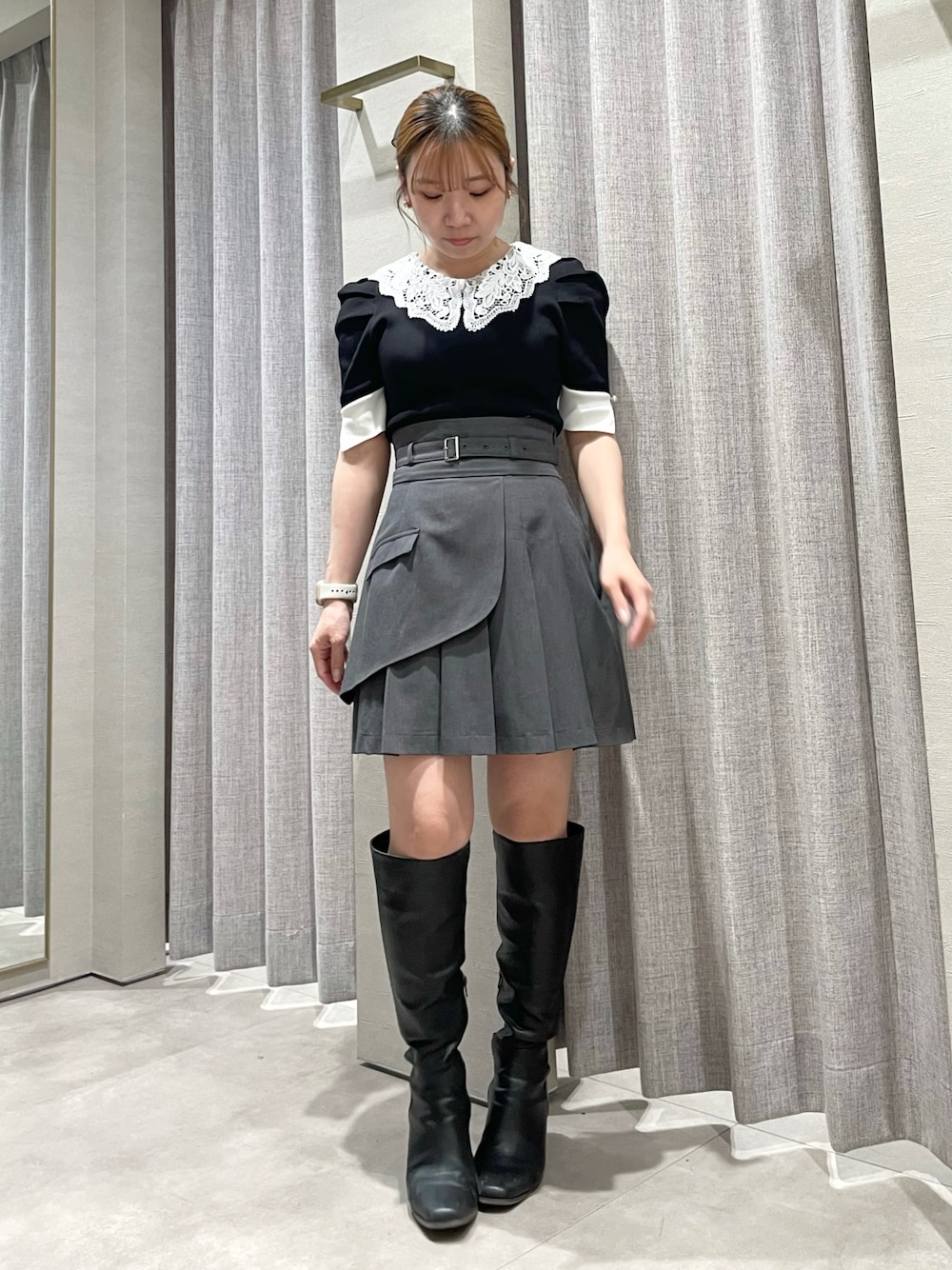 【トップス】シャリ感あるニットだから夏まで着やすいです!おっきめな襟が小顔効果アップしてくれます◎ 【スカート】Sサイズ着用。145cmでも太ももでるので短めスカートです!ハイウエストなので脚長効果もあるので低身長さんにもおすすめです!