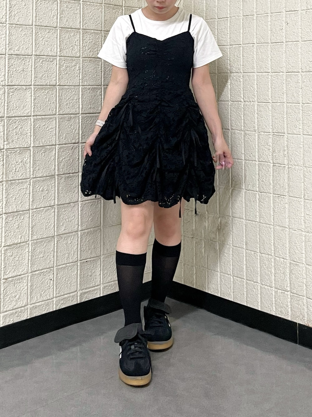 【Tシャツ】Fサイズ着用。ゆったりしすぎてないのでインナーとしても着やすいです! 素材もサラサラなので真夏も着心地◎ 【ワンピース】Sサイズ着用。 アジャスターで調整可なので、145cmでも膝上でしっかりミニで着れました! ソックスコーデも可愛く着れちゃいます◎