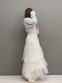 ふんわり甘めコーデ♡ 【トップス】F ※キャミソールとボレロは別売りです! キャミソールにチョーカー付きですが、首元スッキリ着たかったのでなしで着用してます。 さらふわなシャギー素材でとっても着心地がいいです♡ 丈感も短めなので、どんなボトムスも合わせやすいです! 【スカート】Fサイズ 145cmでも足首見えるくらいで短めでした! ランダムな裾なので短すぎる長すぎるは感じにくそうです。 ウエストもぐるっとゴムで着脱も楽ちんでした! 【シューズ】Sサイズ 足のサイズ22.5~23.0