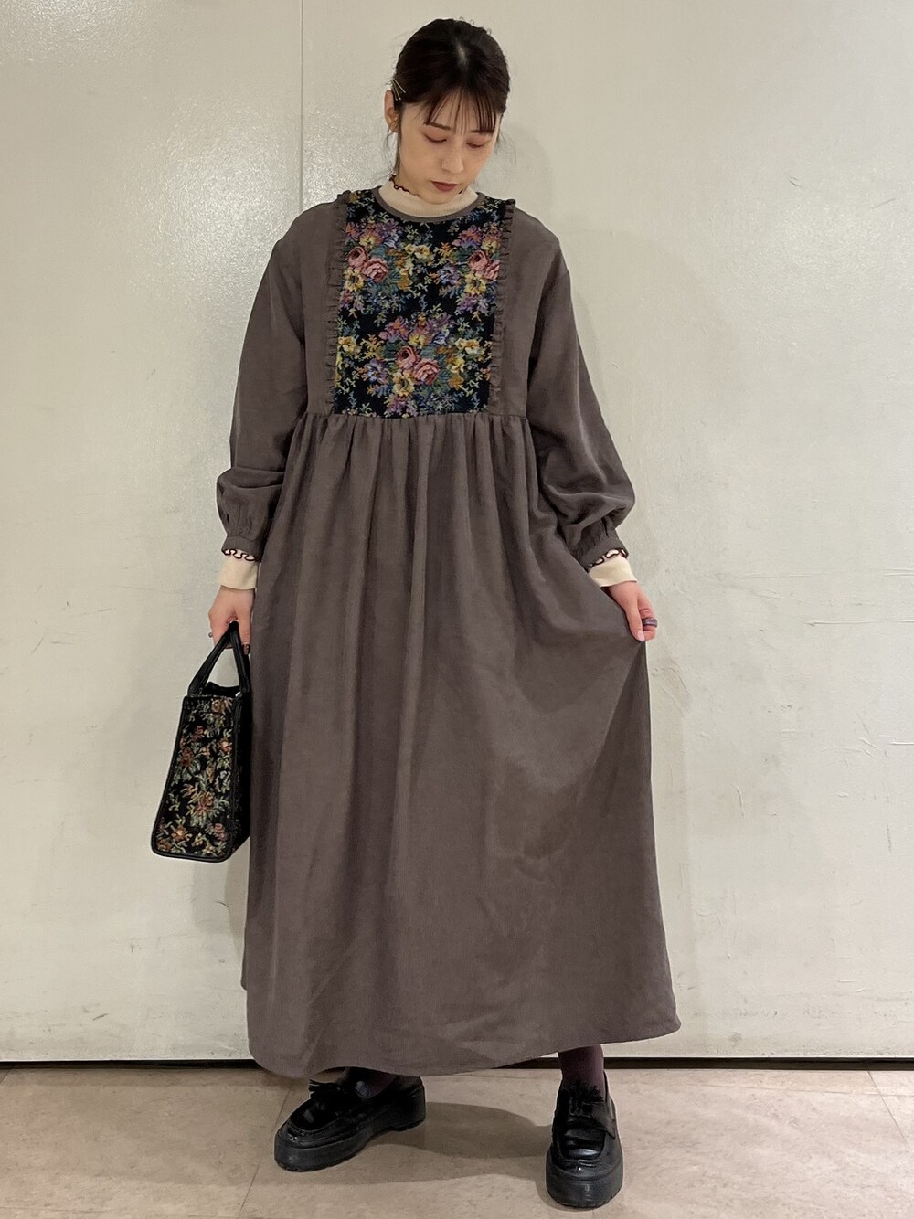ジャガー同時にコンビコールワンピースのブラウンはグレー味のあるくすみカラーで冬らしく、インナーや小物のレイヤードアイテムのカラーは幅広く合わせていただけます。ウエストはゆったりとしていて楽な着心地ですがギャザーが高い位置にあるのでスタイルアップ効果◎ 高身長さんにおすすめのロング丈です。
