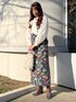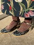 チューリップジャンスカはカラフルで春らしい色味のアイテム。大人メリーコーデにはネイビーがおすすめです!フリルボウタイブラウスはボリュームスリーブなのでジャンスカやキャミワンピなど袖が出るものでレイヤードするとかわいいです。スパンコールベロアミュールのカーキはスパンコール部分が青なので、ジャンスカに合わせて選んでいます。