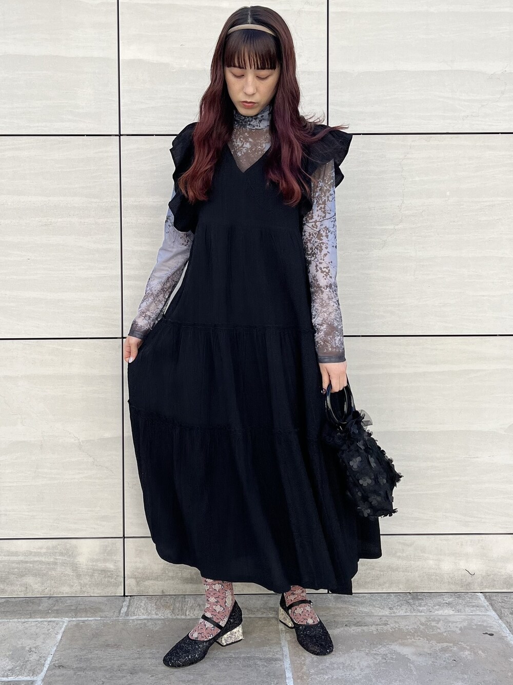 大人メリーさんにおすすめのブラックコーデ。透け感のあるdiaryエアリーメッシュtopsと薄手でふんわりとした生地のレースアップティアードワンピースは素材の軽やかさで春らしさを出しています。バイカラーストラップレースshoesはヒールの色が白になっていて透け感があるので、重たい印象にならないです!